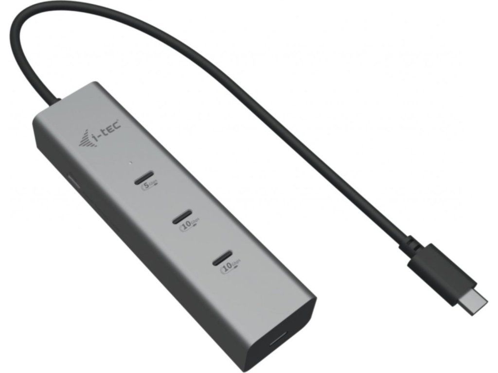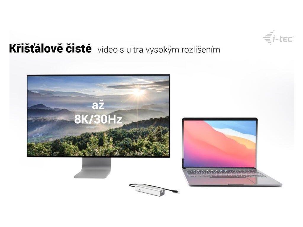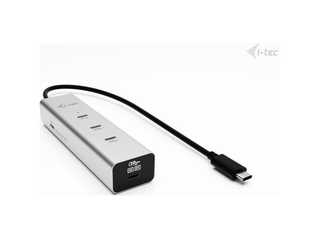 S prémiovým USB-C hubem i-tec se ve změti kabelů svým pracovních zařízení neztratíte. Tento kovový pašák se jen tak nezhroutí a poskytne vám vše potřebné pro náročnou a efektivní práci. Disponuje celkem 5 porty USB-C: 1× USB-C PD vstup, 1× USB-C 3.2 Gen1, 2× USB-C 3.2 Gen2, 1× USB-C video. Pro připojení celého Hubu slouží integrovaný kabel USB-C, takže jej už nikdy nemusíte hledat. Výstup videa až v 8K při 30 Hz zajišťuje podpora DisplayPort Alt Mode.