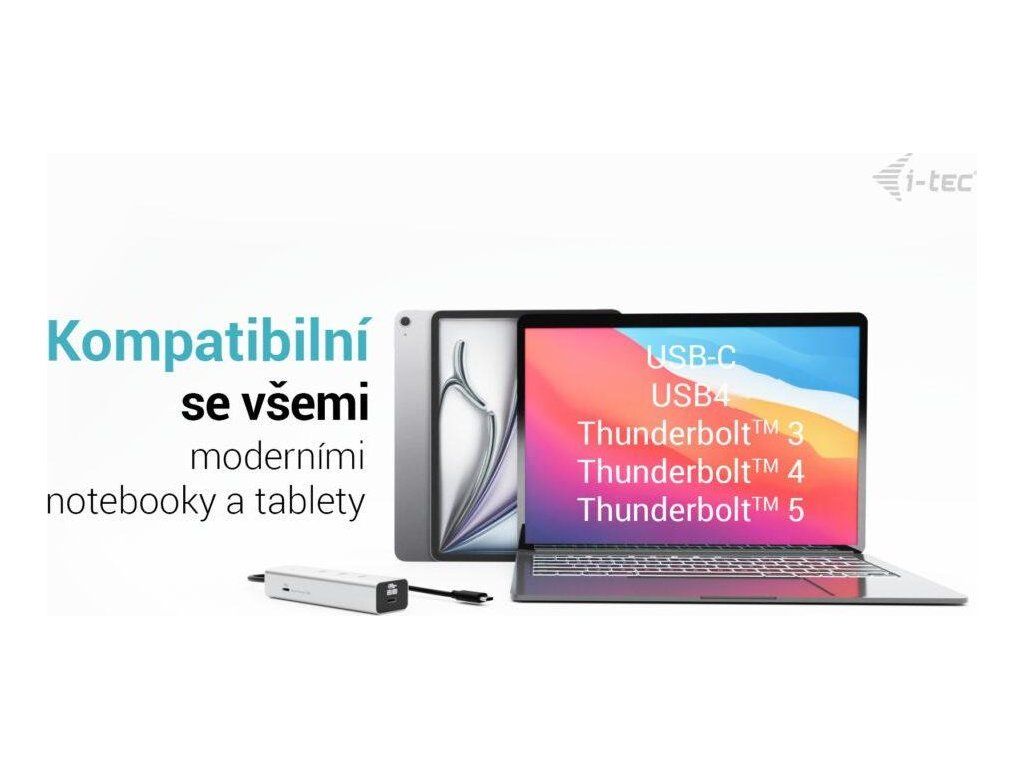 Hub je kompatibilní se zařízeními s porty USB-C, USB4 nebo Thunderbolt 3, 4 či 5. Pro využití funkce Power Delivery a video výstupu je nutná podpora těchto technologií na straně zařízení.
