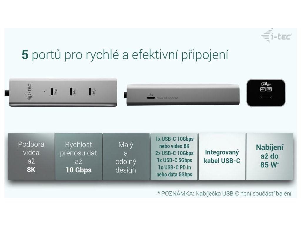 Porty: 1× USB-C PD vstup (100 W), 1× USB-C 3.2 Gen1 (5 Gbps), 2× USB-C 3.2 Gen2 (10 Gbps), 1× USB-C video