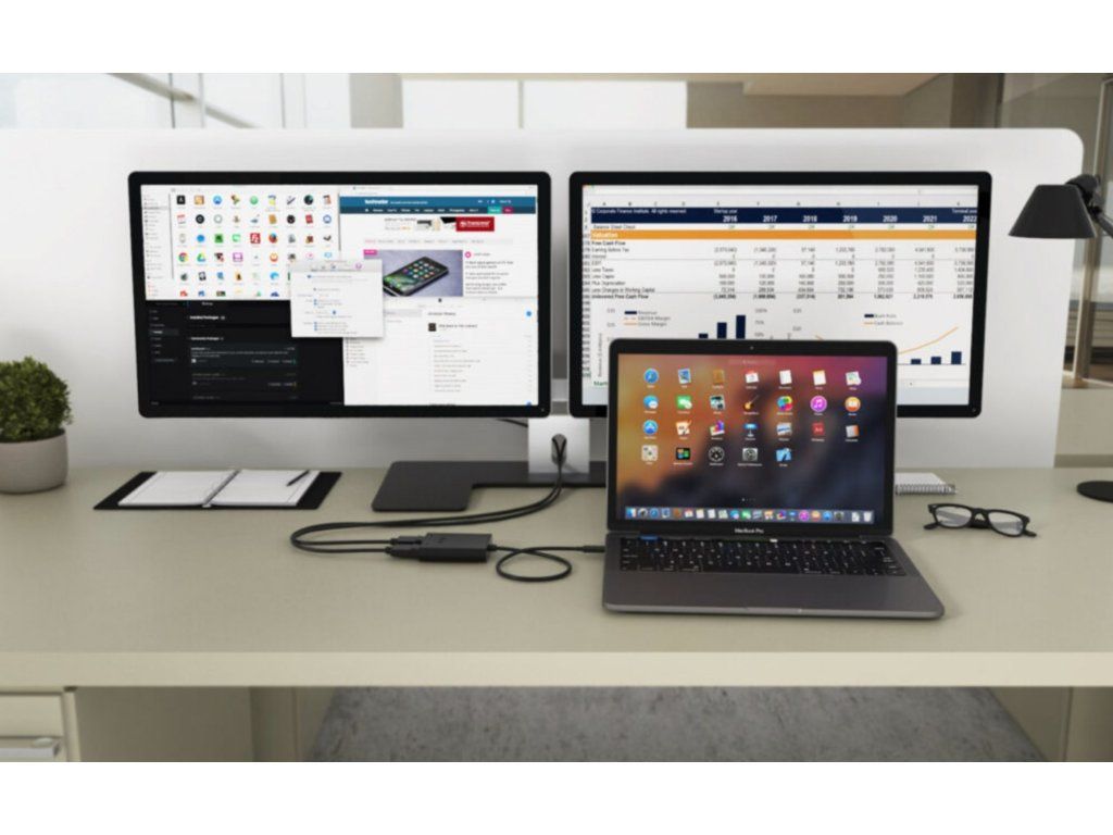 • Výkonný videoadaptér USB-C, ke kterému lze připojit až dva monitory současně