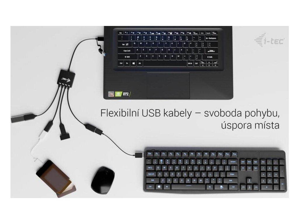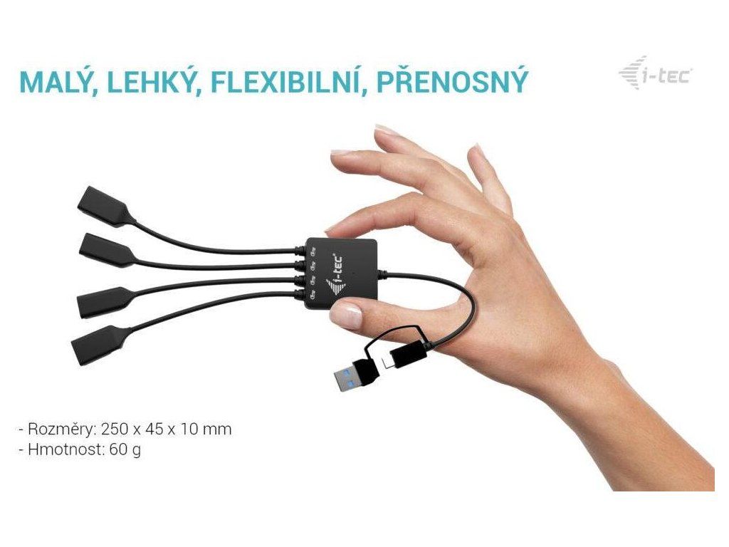 Pro připojení USB Hubu I-TECH slouží port USB/USB-C, což zajistí flexibilní konektivitu k notebookům moderním tabletům. Design je navržen s ohledem na snadné přenášení. I-TEC USB-C/USB-A HUB dosahuje nízké váhy a je ideální na cesty. Ohebné kabely podpoří ideální organizaci na vašem pracovním stole.