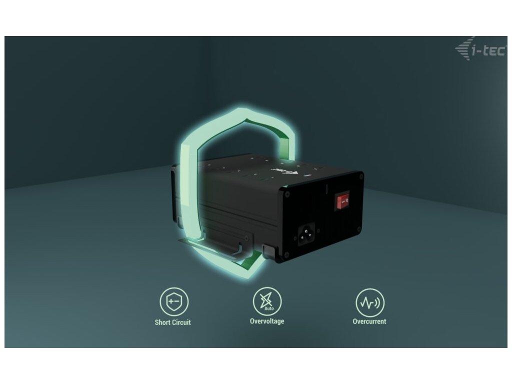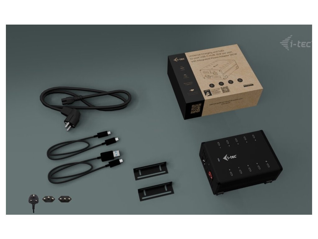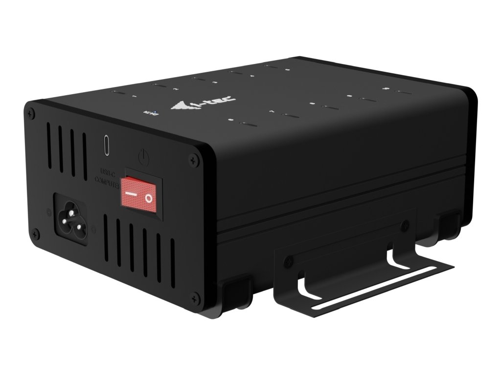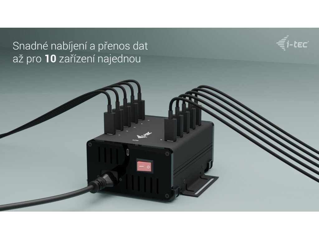 Výkonný HUB s tichým chodem vhodný pro nabíjení a přenos dat. Díky možnosti připojení skrze USB 3.0, USB-C či Thunderbolt 3/4 port je kompatibilní se všemi moderními notebooky. Má k dispozici 10 portů USB-C, z nichž každý podporuje nabíjení zařízení až 15 W a přenos dat rychlostí až 5 Gb/s (2× 5 Gbps, 8× 480 Mbps). Pokud chcete pouze nabíjet, není třeba HUB připojovat k počítači. Balení obsahuje napájecí adaptér s výkonem 180 W. Samozřejmostí je přepěťová a proudová ochrana.