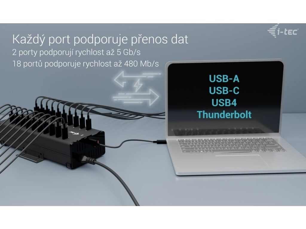 • 18x port USB-C podporující přenosovou rychlost až 480 Mb/s