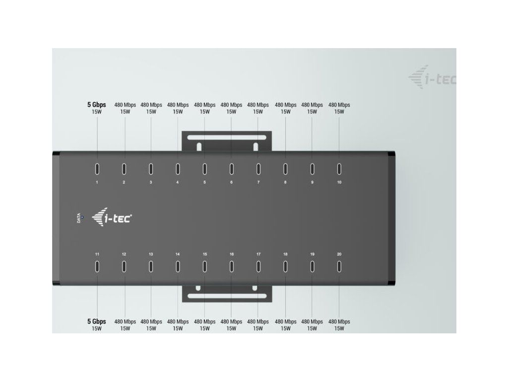 Tento moderní HUB nabízí 20 USB-C s funkcí Plug & Play a nabíjením až 15W na port. Díky tomu, že HUB má 20 USB portů, je možno nabíjet až 20 zařízení najednou.