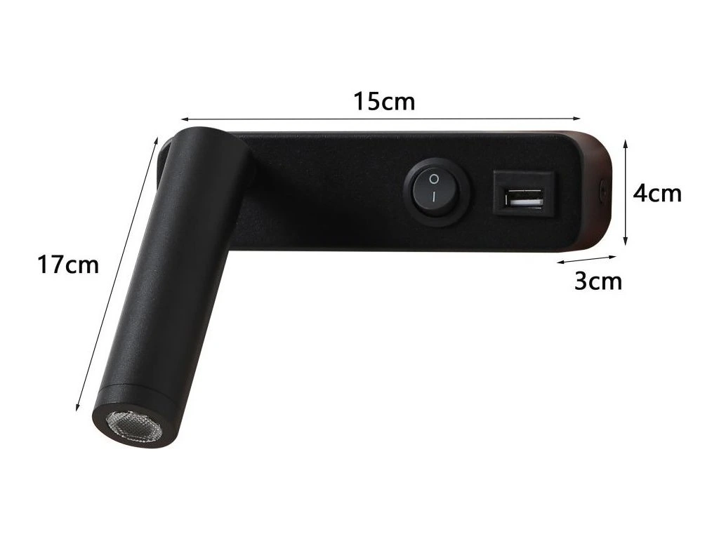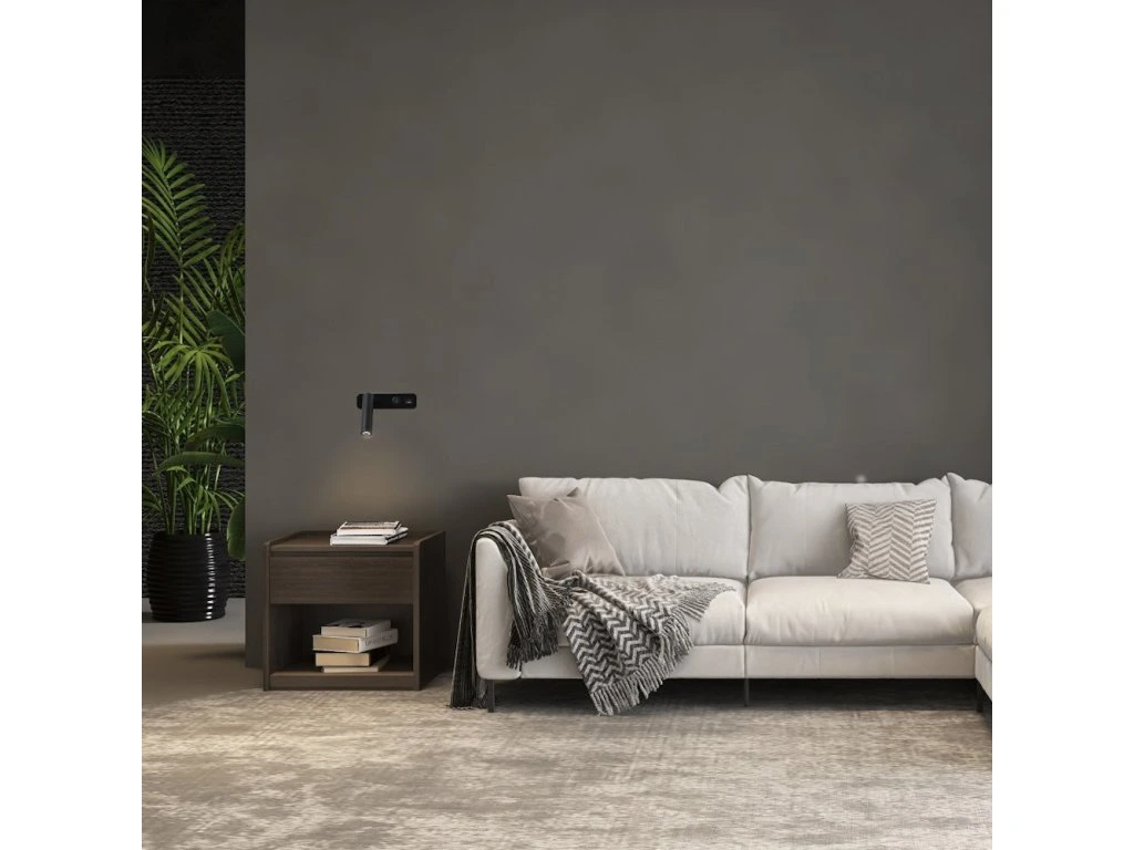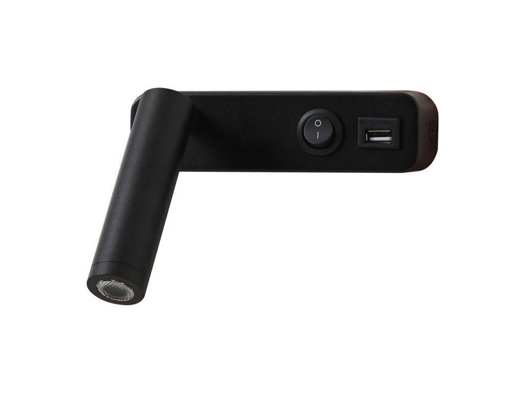 Nástěnné bodové LED svítidlo s výkonem 3 W. Disponuje válcovitou hlavou, kterou lze otáčet v rozsahu 330° a vyklápět o 90°, což umožňuje přesné zacílení tam, kde je potřeba. Mechanický kulatý vypínač umístěný na těle svítidla umožňuje jednoduché a pohodlné ovládání. Předností je také integrovaný USB port pro snadné nabíjení elektronických zařízení, což z něj činí ideální doplněk k posteli nebo pracovnímu stolu.
