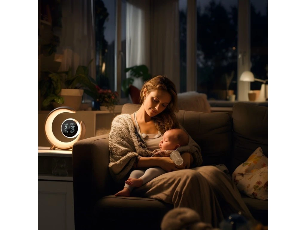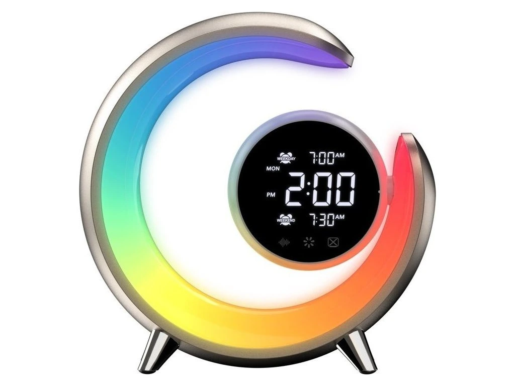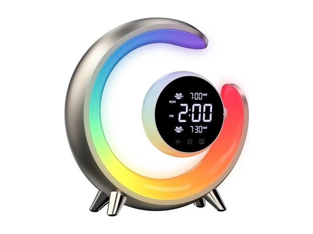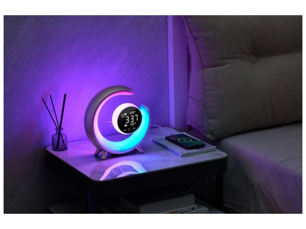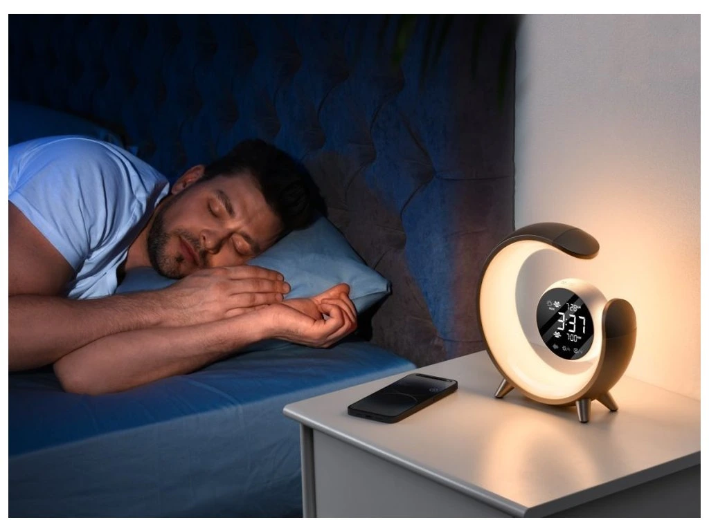 Netradiční LED stolní lampička s praktickým digitálním displejem a s efektním RGB podsvícením. Nabízí teplý odstín světla a plynulé stmívání. Tato lampička je ideální do dětských pokojíčků díky možnosti přehrávání sedmi různých přírodních zvuků k večernímu zklidnění. Samozřejmostí je poté automatické vypnutí v režimu 30/60/90 minut. LED displej disponuje dvoustupňovým nastavením jasu i možností úplného vypnutí. K dispozici je navíc i funkce duálního budíku, která nabízí dva různé časy probuzení, na pracovní týden a druhý na víkend. K dispozici je také USB výstup pro nabíjení mobilních telefonů.