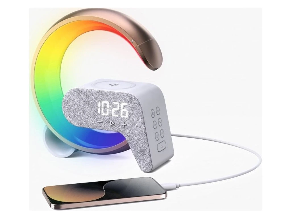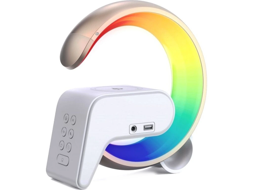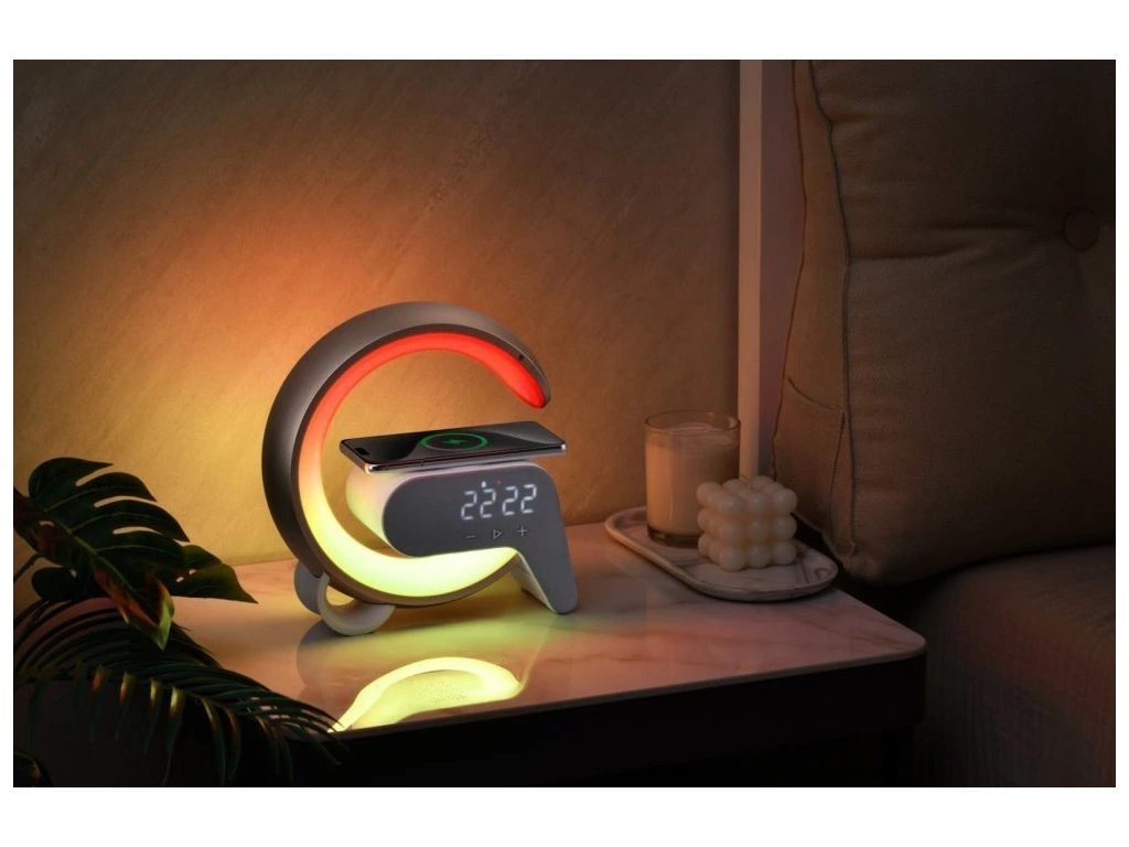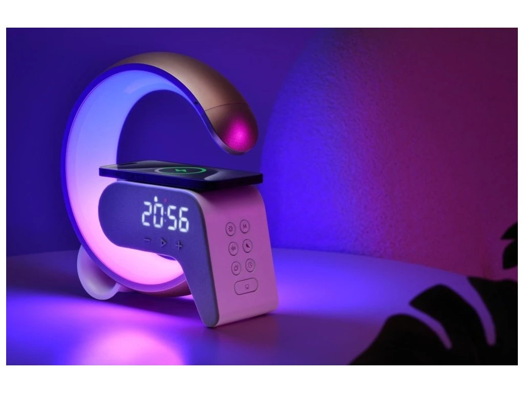 Netradiční LED stolní lampička s praktickým digitálním displejem a s efektním RGB podsvícením. Nabízí teplý odstín světla a plynulé stmívání. Tato lampička je ideální do dětských pokojíčků díky možnosti přehrávání šesti různých přírodních zvuků či bílého šumu k večernímu zklidnění. LED displej disponuje možností ztlumení i úplného vypnutí. Pro přehrávání hudby z mobilního zařízení bez nutnosti připojení kabelu je připraven Bluetooth reproduktor. K dispozici je navíc i duální budík pro dva různé časy probuzení, bezdrátová nabíječka standardu Qi a nabíjecí USB port pro nabíjení mobilních telefonů.
