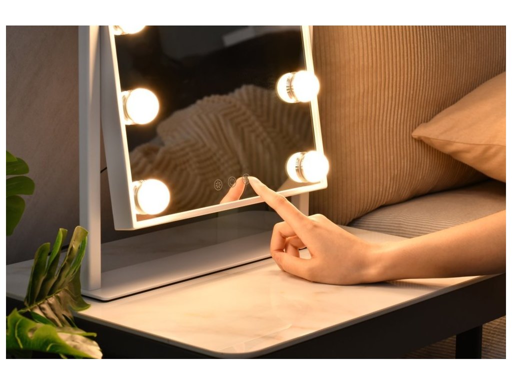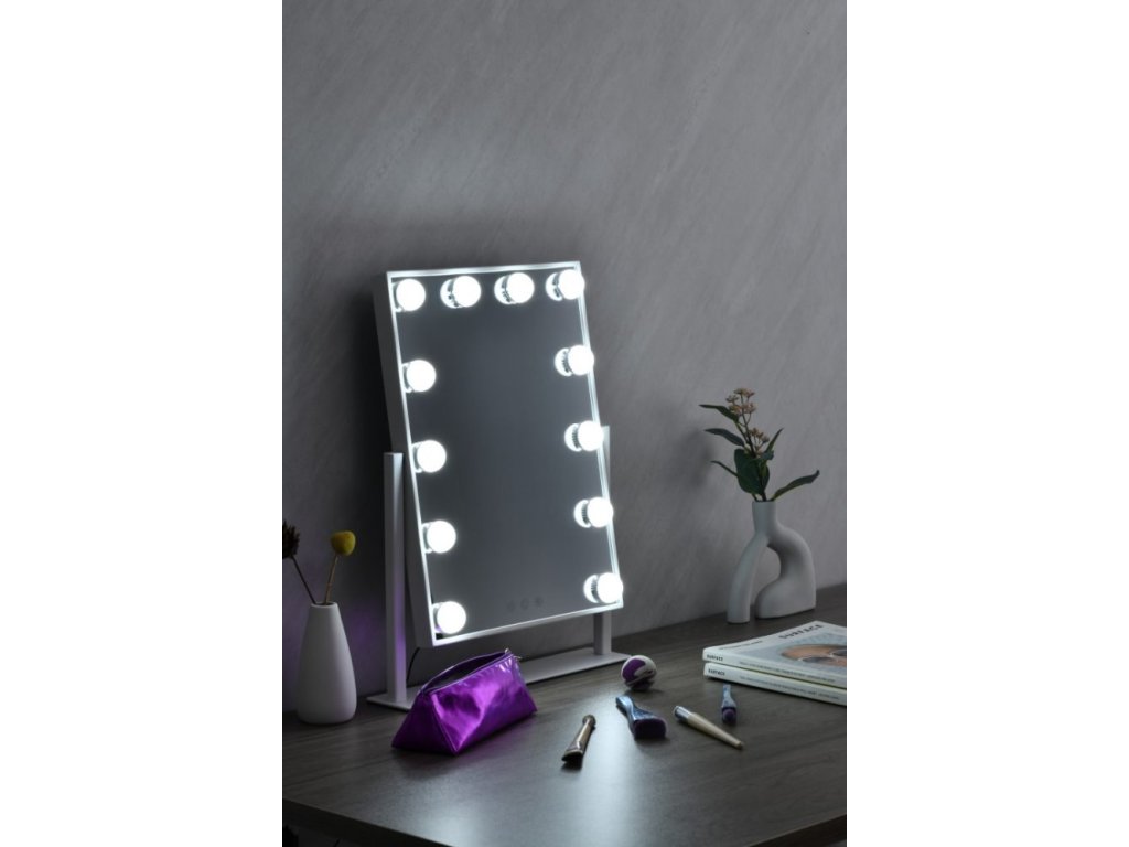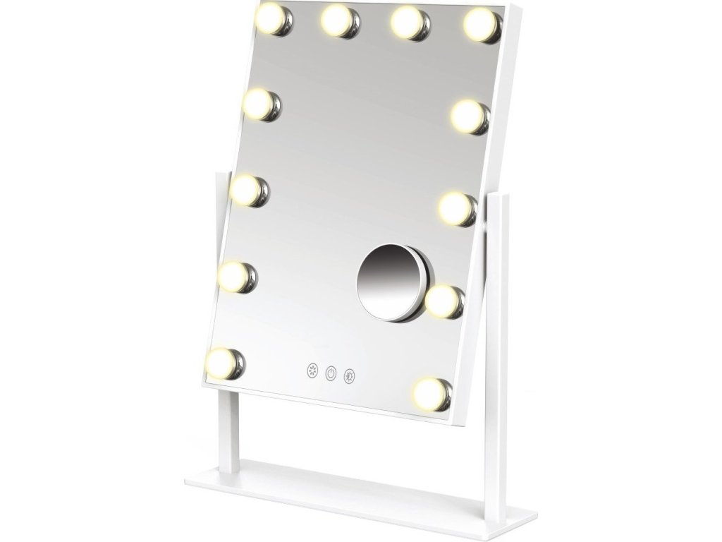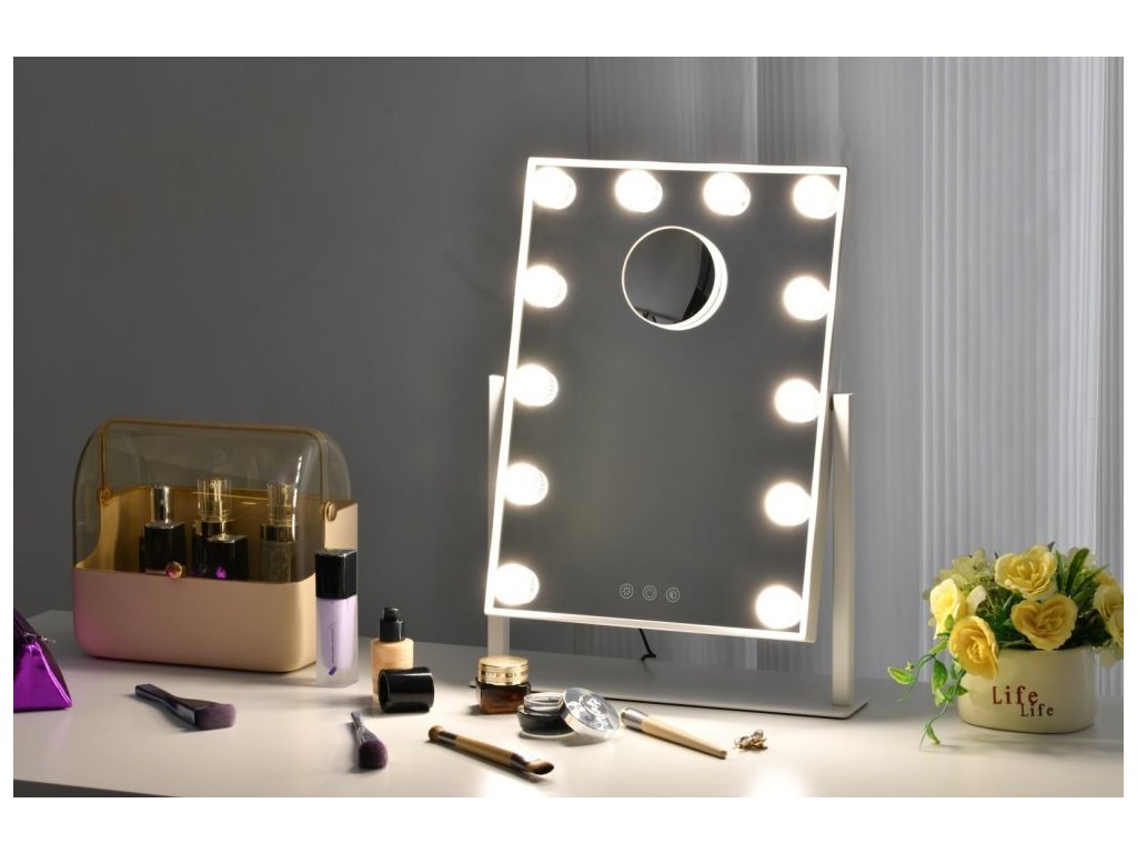 Velké, designové, kosmetické zrcadlo pro každodenní líčení je ideální dárek pro každou ženu. Disponuje 12 diodami s možností stmívání a volby tří různých odstínů bílé pro regulaci osvětlení podle potřeby. Snadné ovládání zajišťují dotyková tlačítka přímo na zrcadlové ploše. Přídavné 10× zvětšovací zrcátko s přísavkou umožňuje detailní práci na očních linkách, konturách rtů a dalších jemných detailech. Samozřejmostí je možnost nastavení libovolného náklonu zrcadla.