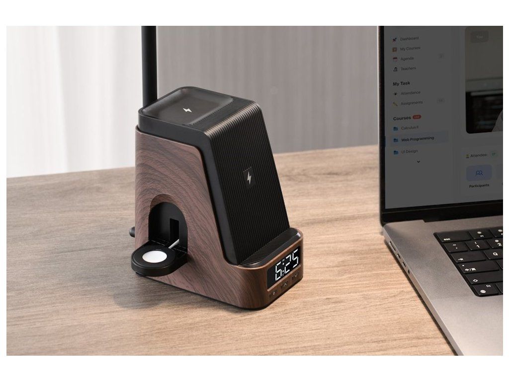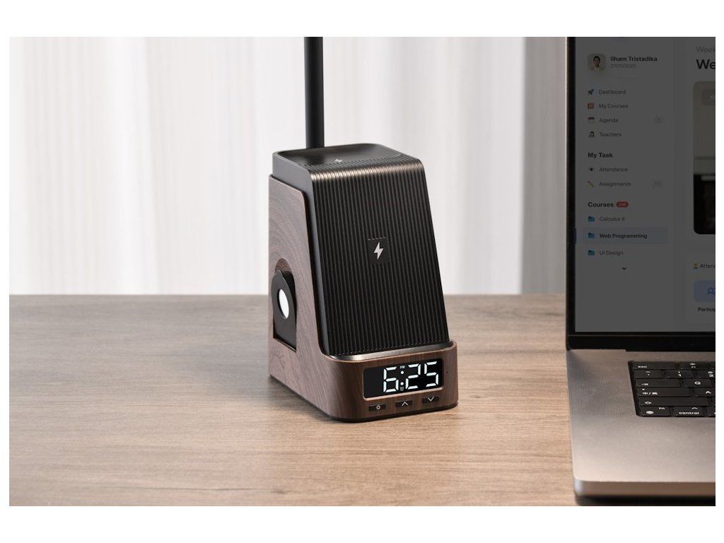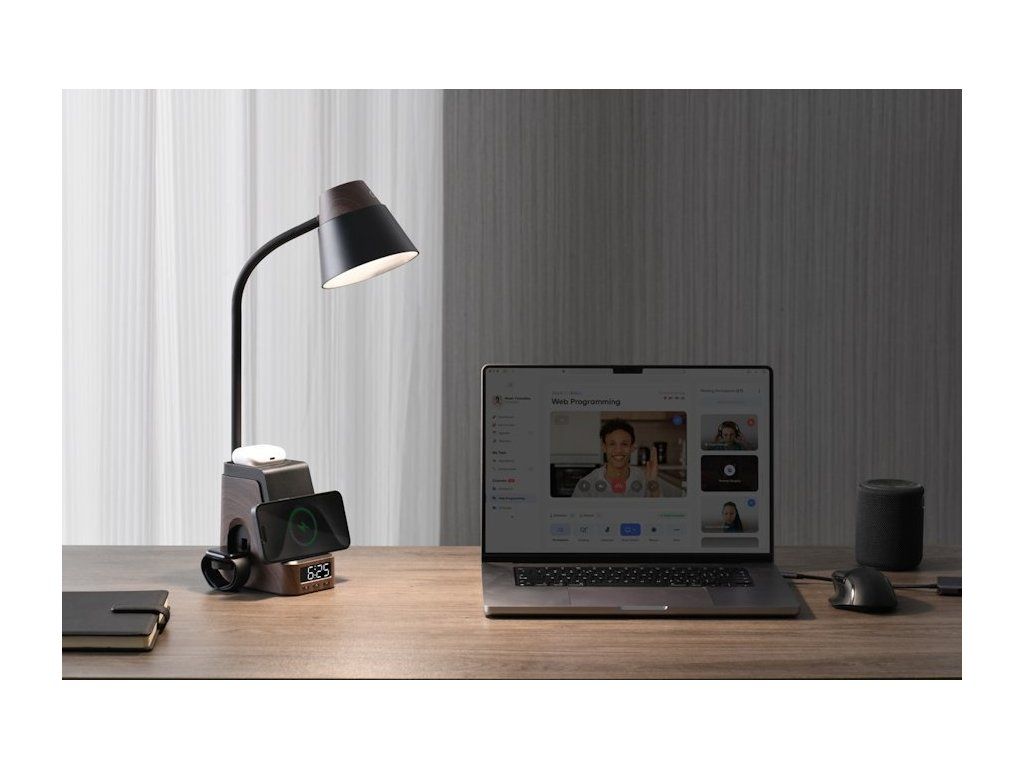 Lampa nabízí nastavitelnou teplotu barev CCT od teplé 2700 K přes neutrální 4000 K až po studenou 5000 K, každou ve třech stupních jasu. Vestavěný LCD displej zobrazuje čas ve formátu AM/PM a umožňuje nastavení budíku. Bezdrátové nabíjení Qi o výkonu 5 W a dodatečný USB výstup 5V/1A zajistí pohodlné nabíjení všech vašich zařízení.