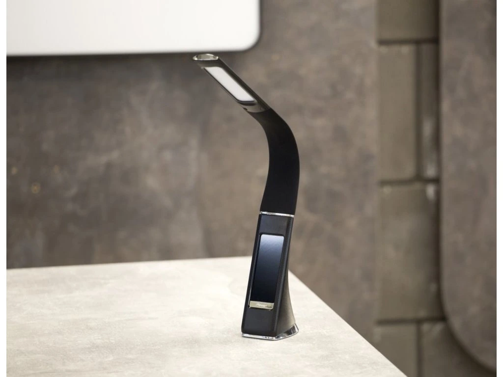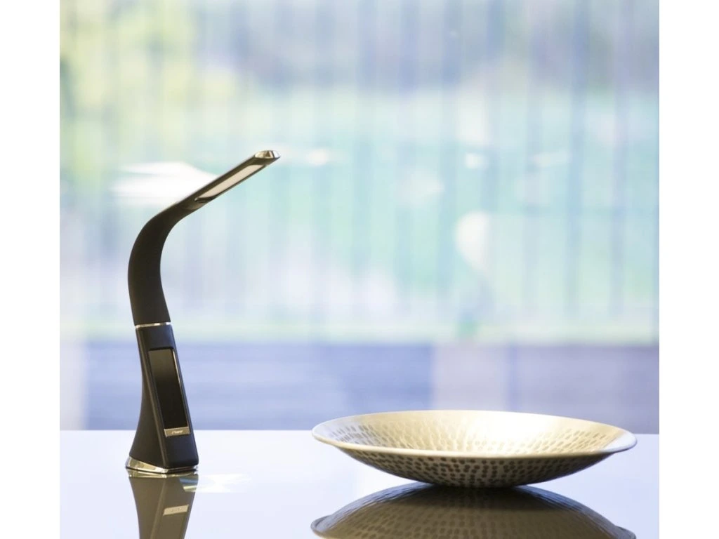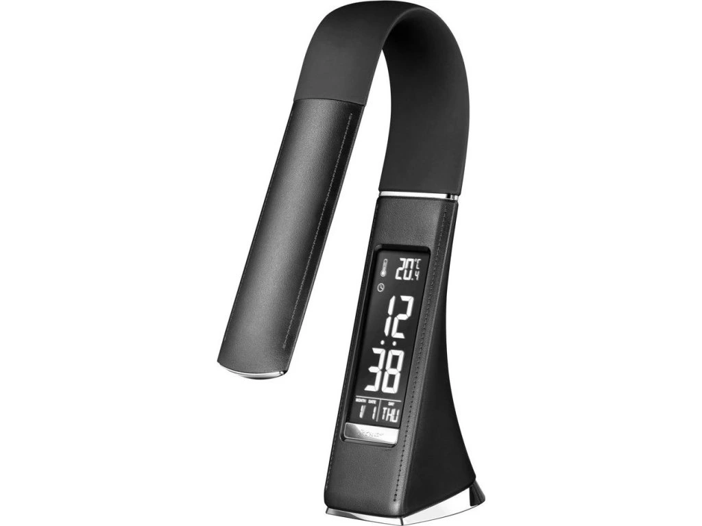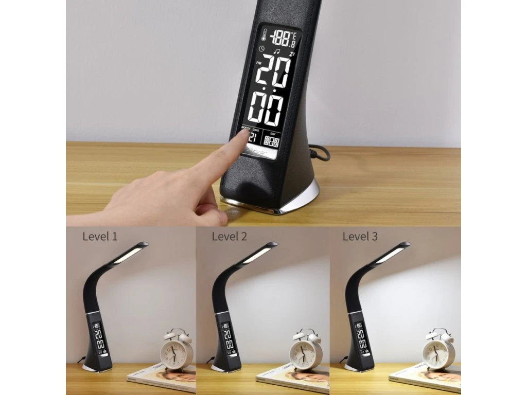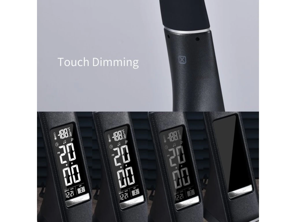 Moderní LED stolní lampička s ohebným ramenem, dotykovým ovládáním jasu a informačním LCD panelem, který zobrazuje údaje o aktuálním času, datu a teplotě. Pokud by vás LCD panel rušil, je možné jej úplně vypnout. Napájení je realizováno skrze přiložený adaptér, nebo přímo z USB portu počítače či powerbanky. Součástí balení je USB kabel o délce 120 cm.