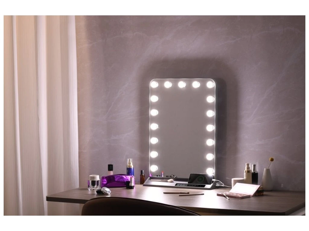 Elegantní kosmetické zrcadlo s LED osvětlením v hollywoodském stylu poskytuje ideální světelné podmínky pro každodenní líčení i profesionální makeup. Zrcadlo je osazeno výkonnými LED pásy o celkovém příkonu 18 W a světelném toku až 1400 lm, které zajišťují rovnoměrné osvětlení bez stínů.