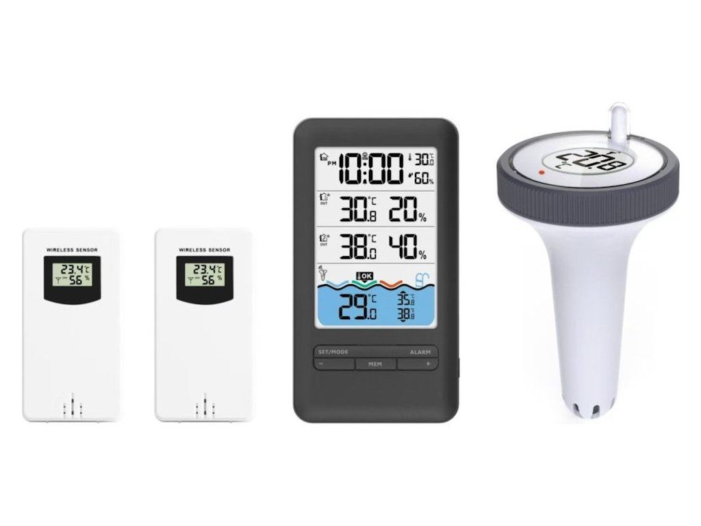 Součástí balení je vnitřní stanice, 1× bazénové čidlo, 2× čidlo teploty a vlhkosti a napájecí kabel.
