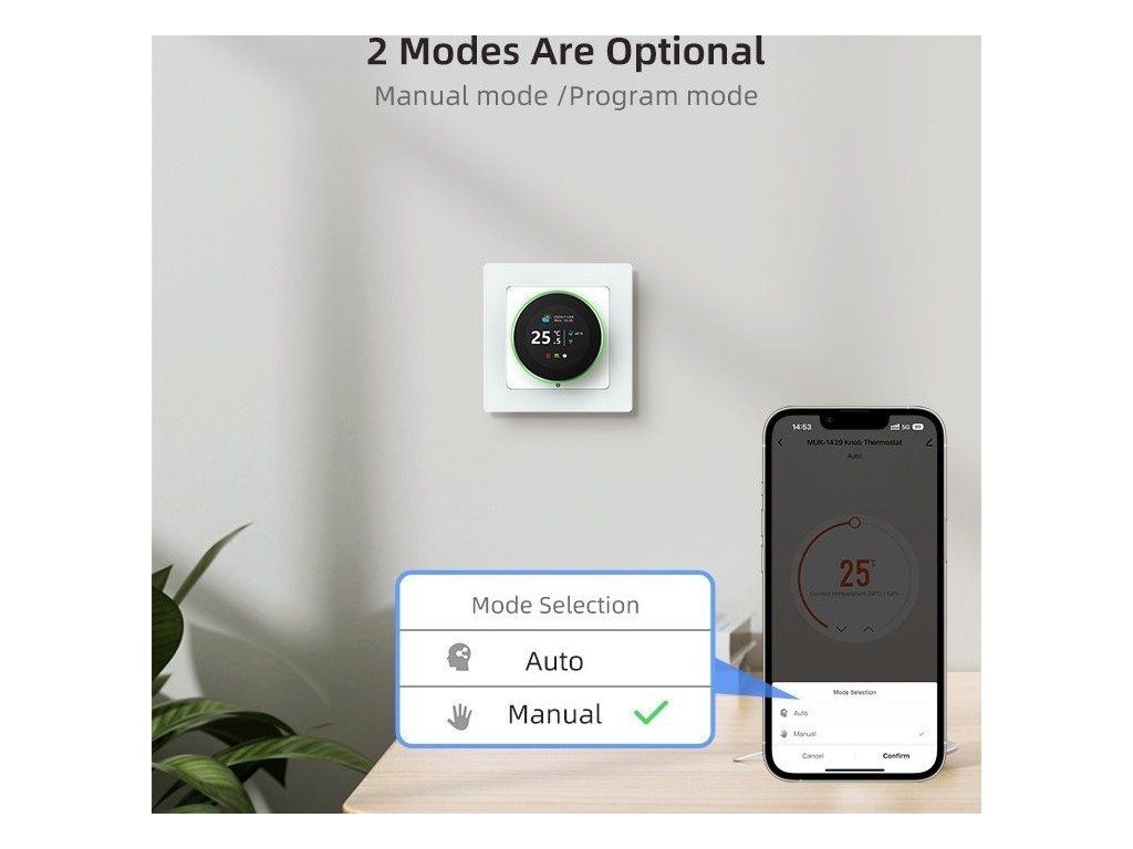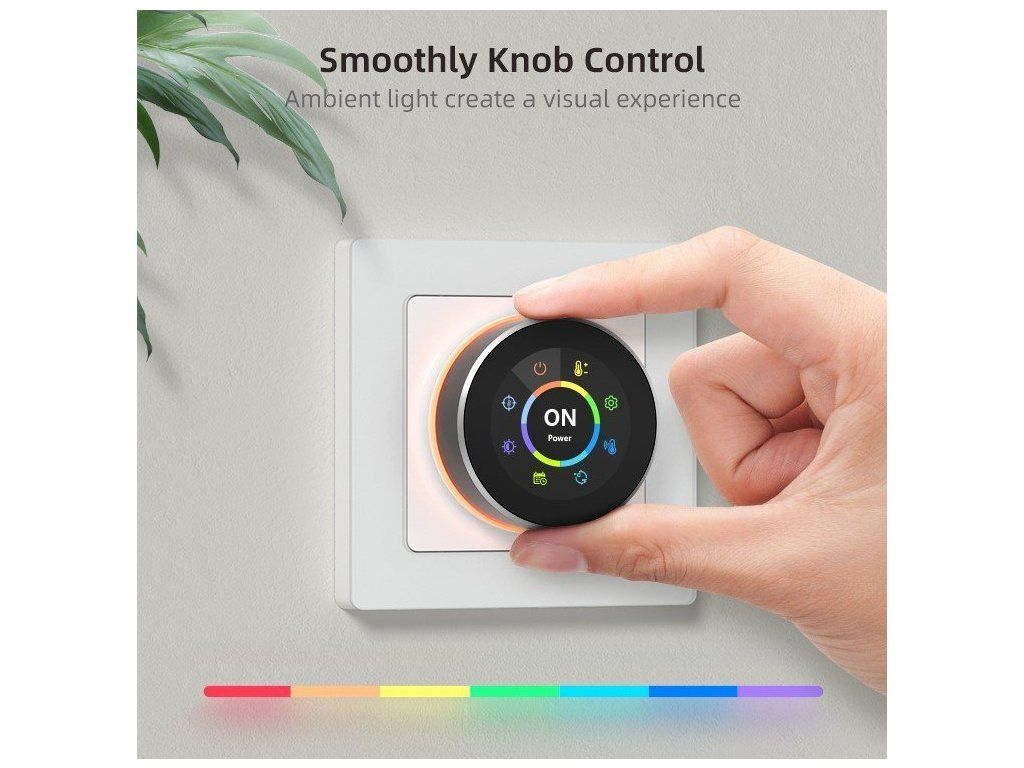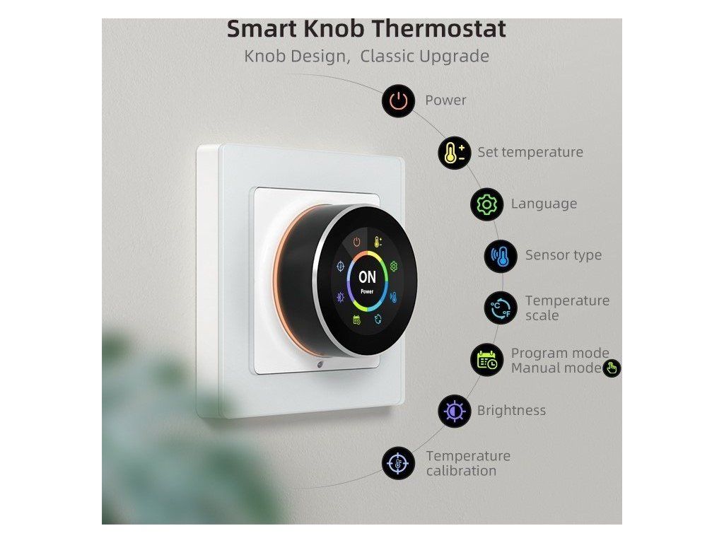 Intuitivní ovládání zajišťuje otočný knoflík, což umožňuje snadné nastavení požadované teploty v rozsahu 5 až 45 °C. Termostat podporuje dva režimy provozu - ruční a programový, přičemž v programovém režimu lze nastavit až 6 časových úseků denně s různými teplotními profily podle vašich potřeb.