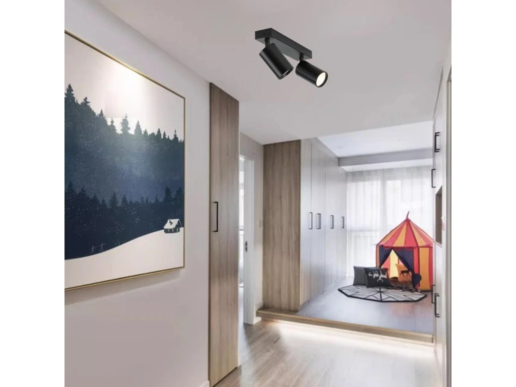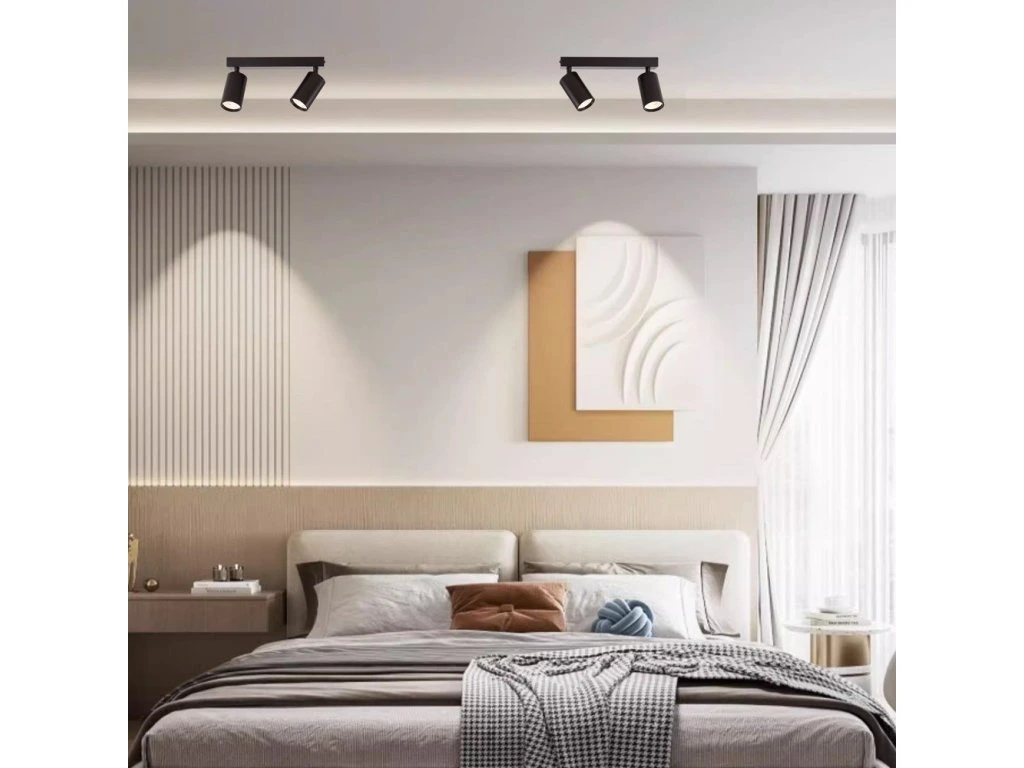 Série bodových svítidel PUNTO představuje kvalitní kovová svítidla v elegantním, matně černém provedení, která jsou ideální volbou pro funkční osvětlení současných interiérů. Svítidla mohou být instalována jako nástěnná i stropní, což zvyšuje jejich flexibilitu a univerzálnost. Dvě směrové hlavy jsou umístěny na 26 cm dlouhé základně a díky pohyblivým kloubům lze světelné pruhy zacílit přesně tam, kde je potřeba. Osazeno je dvěma paticemi GU10 pro instalaci žárovek o max. příkonu 2× 9 W. Součástí balení je sada zlatých kroužků, kterými lze upravit vzhled svítidla na černozlatý.