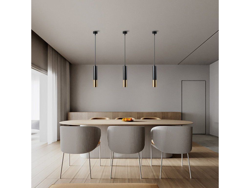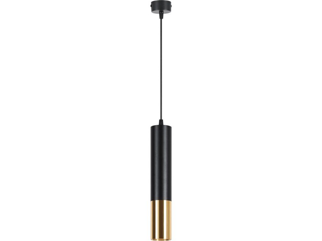 Závěsné bodové svítidlo PUNTO představuje kvalitní kovové svítidlo v elegantním černozlatém provedení, které je ideální volbou pro funkční osvětlení současných interiérů. Kovová hlava je zavěšena na nastavitelném závěsu o délce až 100 cm, umístěném na kulaté základně o průměru 6 cm. Osazeno je paticí GU10 pro instalaci žárovky o max. příkonu 9 W. Hlavu svítidla lze pro snadnější instalaci žárovky odšroubovat.