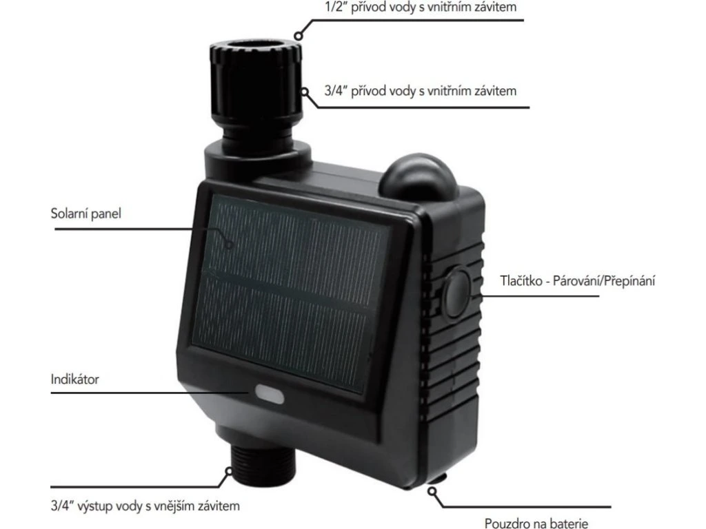 IMMAX NEO SMART zavlažovací ventil + čidlo půdní vlhkosti a teplotyVentil se solárním panelem pro vytvoření chytrého zavlažovacího systému. Prostřednictvím aplikace pro chytré telefony lze nastavovat zavlažovací cykly, rozsah průtoku a sledovat stav otevření ventilu. Napájení je řešeno dvěma AA bateriemi (nejsou součástí balení), které jsou dobíjeny pomocí vestavěného solárního panelu. Zařízení komunikuje na protokolu ZigBee 3.0. Bezplatná aplikace IMMAX NEO PRO je kompatibilní se systémy TUYA, Lidl a podporuje hlasové ovládání pomocí Google Assistant, Amazon Alexa a Apple Siri. Součástí balení je také bezdrátové čidlo, které v reálném čase monitoruje teplotu a vlhkost půdy.