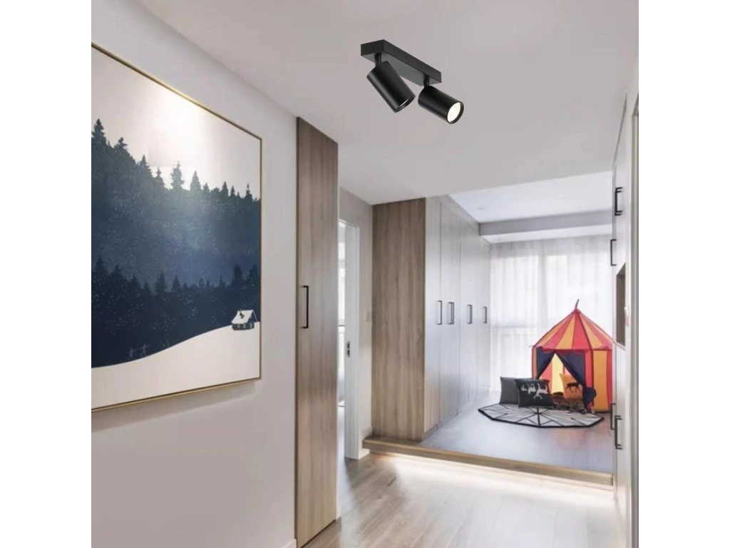 Série bodových svítidel PUNTO představuje kvalitní kovová svítidla v elegantním, matně černém provedení, která jsou ideální volbou pro funkční osvětlení současných interiérů. Svítidla mohou být instalována jako nástěnná i stropní, což zvyšuje jejich flexibilitu a univerzálnost. Dvě směrové hlavy jsou umístěny na 26 cm dlouhé základně a díky pohyblivým kloubům lze světelné pruhy zacílit přesně tam, kde je potřeba. Osazeno je dvěma paticemi GU10 pro instalaci žárovek o max. příkonu 2× 9 W. Hlavu svítidla lze pro snadnější instalaci žárovky odšroubovat.