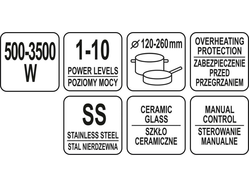 Je určen pro indukční hrnce a pánve o průměru 140 až 260 mm. Má také funkci automatického nastavení topné plochy v závislosti na průměru základny pánve. Po vyjmutí z desky se však zařízení automaticky vypne.