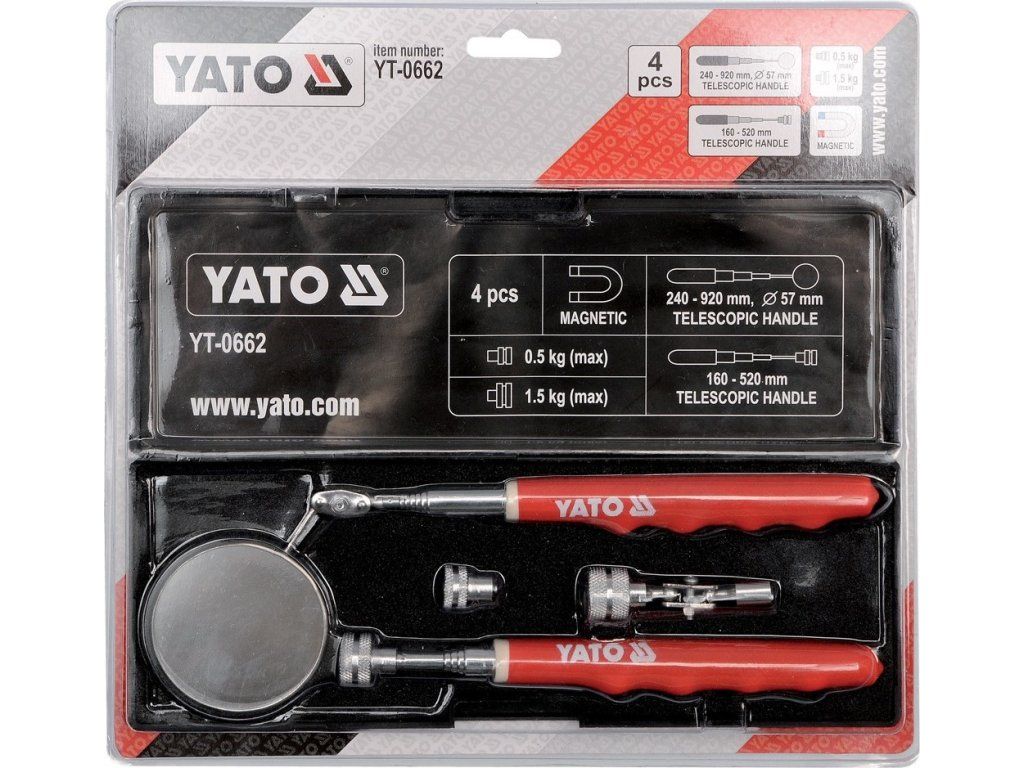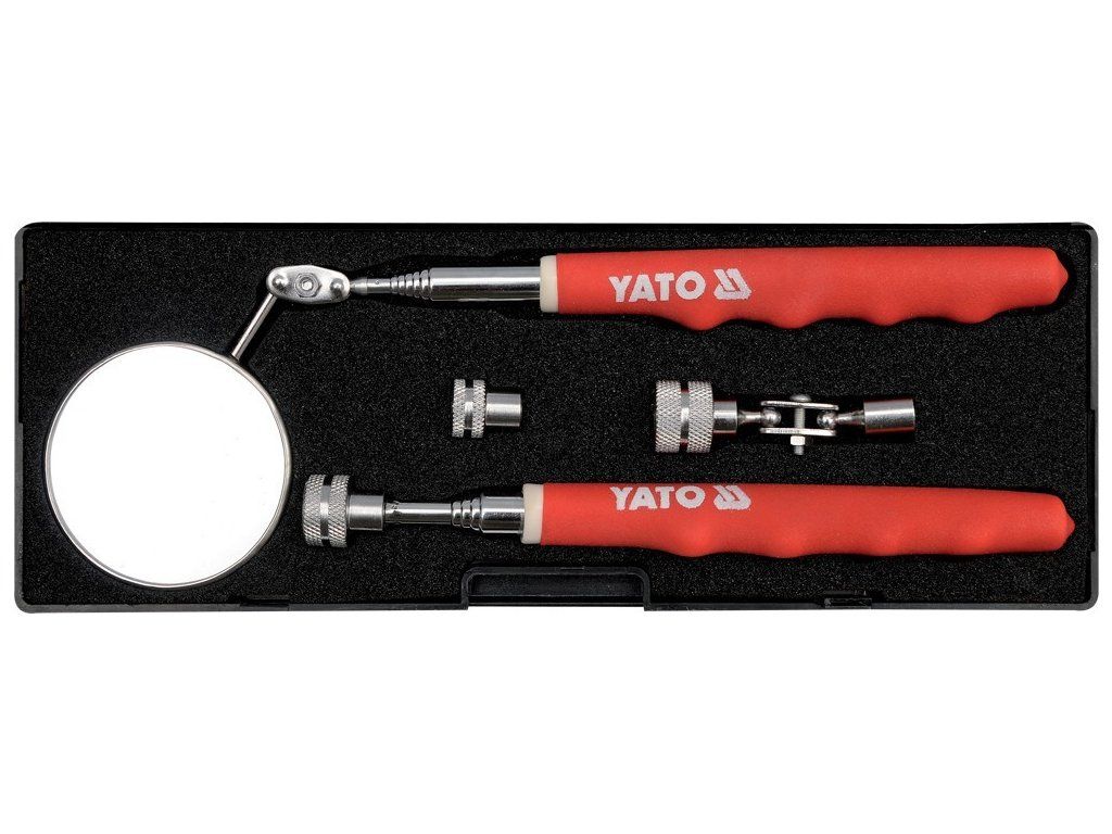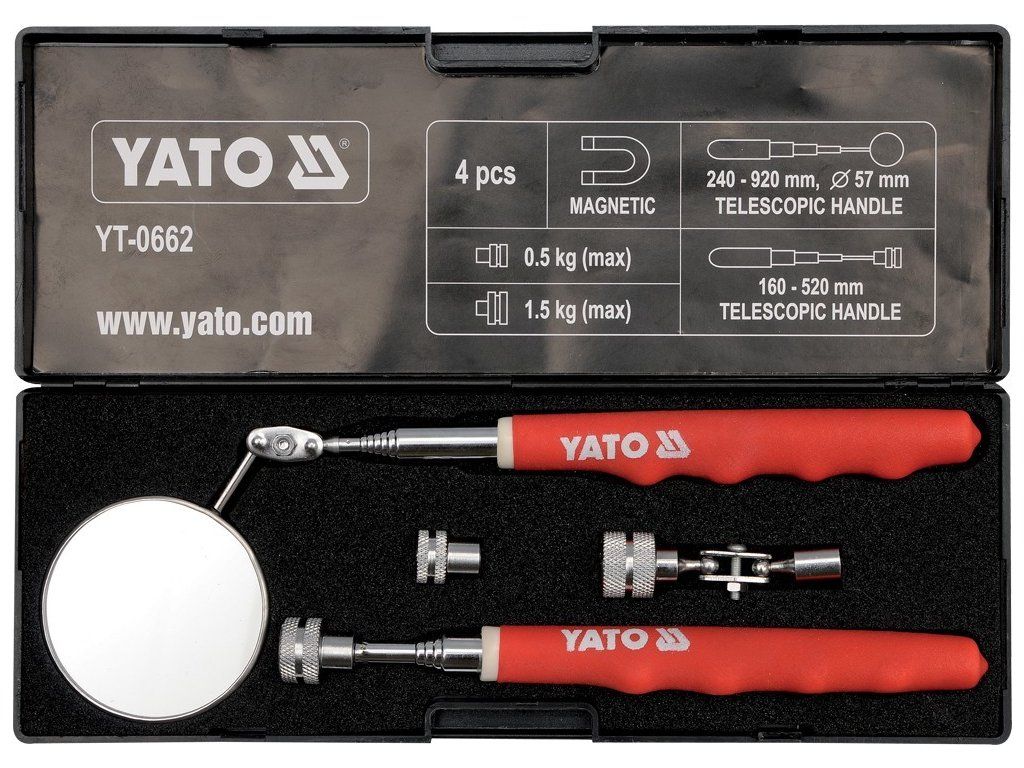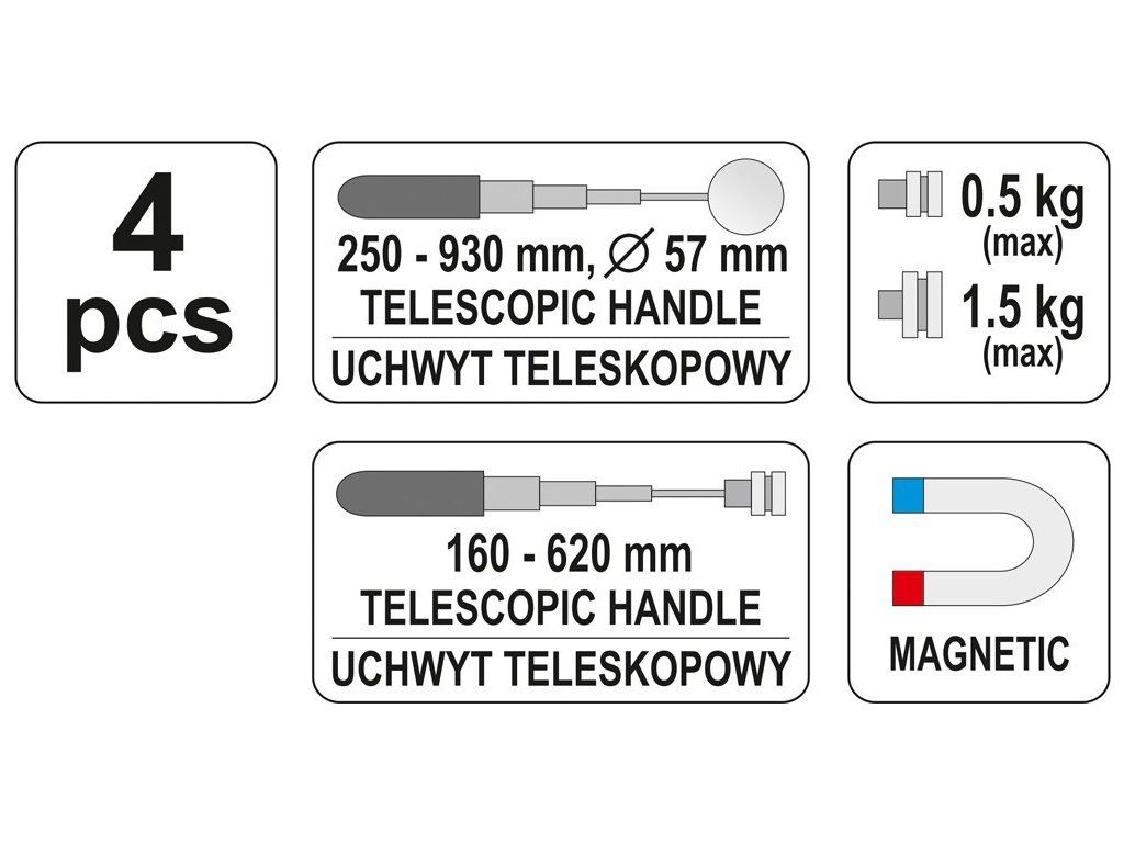 Sada obsahuje teleskopickou rukojeť délky 160 - 620 mm pro magnetické patky, teleskopickou rukojeť délky 250 - 930 mm s kloubovým inspekčním zrcátkem průměru 57 mm a magnetické patky 13; 16; 20 mm s nosností 0,5; 1; 1,5 kg.