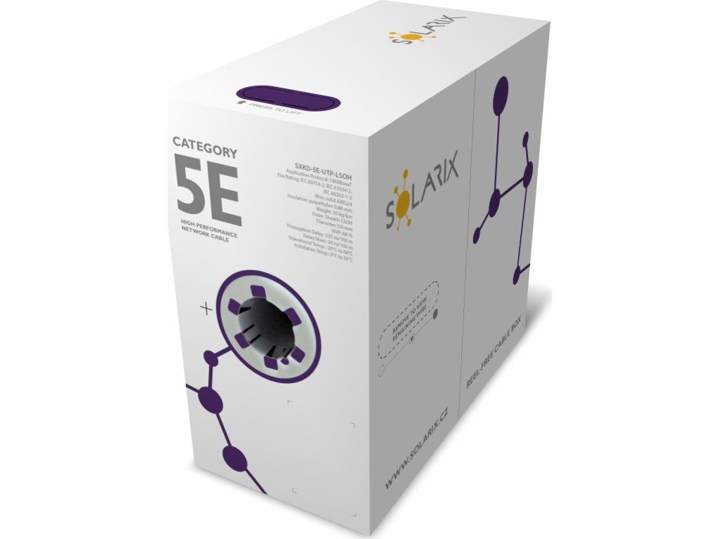 Instalační kabel Solarix s označením SXKD-5E-UTP-LSOH je spolehlivý nestíněný kabel kategorie 5E, který je testován až do šířky pásma 350 MHz, a je určený pro provoz ethernetových protokolů, včetně 2.5GBASE-T a 5GBASE-T*. Konstrukce kabelu je U/UTP, typ pláště LSOH s třídou reakce na oheň Dca-s1,d2,a1. Vodiče kabelu jsou vyrobeny z kvalitního měděného drátu s čistotou mědi 99,97%. Kabel bez problémů splňuje požadavky z mezinárodních standardů ISO/IEC 11801, EN 50173 a ANSI/TIA 568.2-D. Výkonové parametry tohoto kabelu byly otestovány nezávislou testovací zkušebnou FORCE TECHNOLOGY v rámci programu EC Verified, a to na nejvyšší úroveň tzv. Component Level. Certifikát je k dispozici zde na webu v záložce "Odkazy" nebo přímo na stránkách laboratoře FORCE. V případě CPR (nařízení EU č. 305/2011) je kabel testován v systému posuzování vlastností AVCP 3. Stejně jako ostatní kabely Solarix, je i kabel SXKD-5E-UTP-LSOH značen metráží po 1 m v rozsahu od 0 do 500 m. Kabel je dodáván ve vysoce odolném třívrstvém leštěném kartónovém boxu (vždy barevně odlišeném podle typu kabelu), na kterém jsou uvedeny všechny nezbytné produktové informace, včetně čárových kódů, výrobní šarže, popisu a nejdůležitějších technických parametrů.