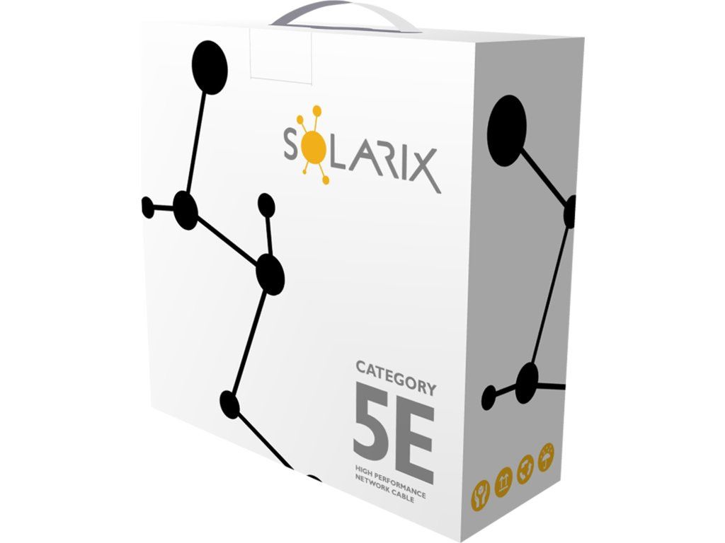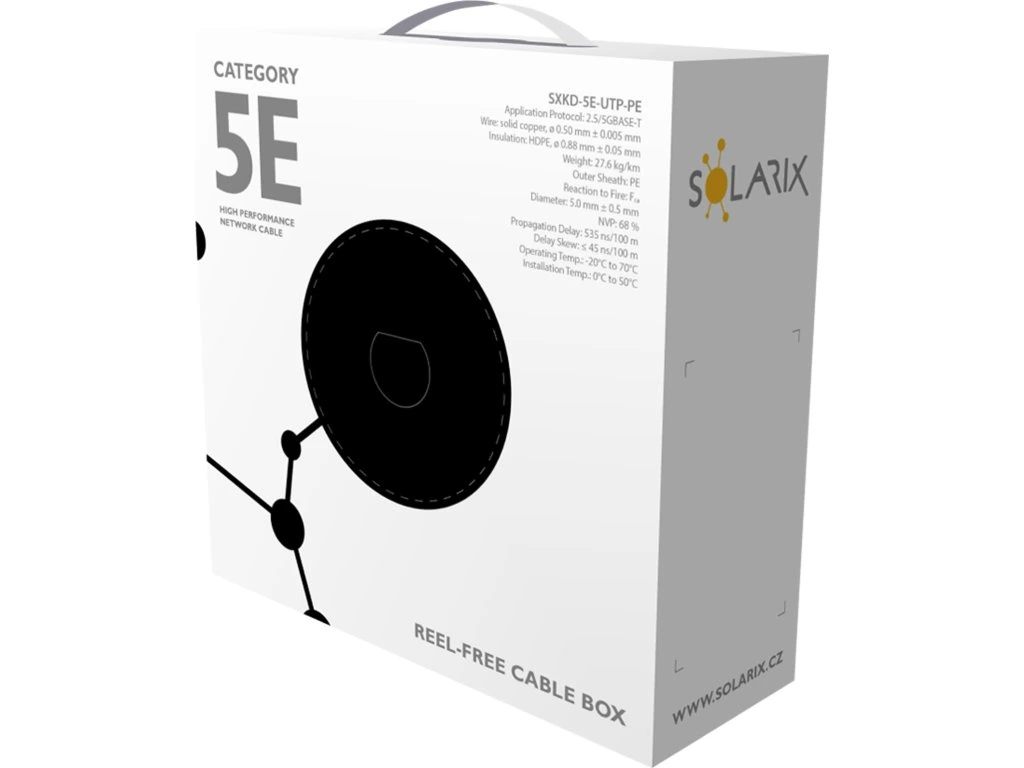 Instalační kabel Solarix s označením SXKD-5E-UTP-PE je spolehlivý venkovní nestíněný kabel kategorie 5E, který je určený pro provoz ethernetových protokolů, včetně 2.5GBASE-T a 5GBASE-T*. Konstrukce kabelu je U/UTP, typ pláště UV stabilní PE s třídou reakce na oheň Fca a stupněm krytí IP67. Vodiče kabelu jsou vyrobeny z kvalitního měděného drátu s čistotou mědi 99,97 %. Kabel bez problémů splňuje požadavky z mezinárodních standardů ISO/IEC 11801, EN 50173 a ANSI/TIA 568.2-D. Stejně jako ostatní kabely Solarix, je i kabel SXKD-5E-UTP-PE značen metráží po 1 m v rozsahu od 0 do 100 m. Kabel je dodáván ve vysoce odolném třívrstvém leštěném kartónovém boxu (vždy barevně odlišeném podle typu kabelu), na kterém jsou uvedeny všechny nezbytné produktové informace, včetně čárových kódů, výrobní šarže, popisu a nejdůležitějších technických parametrů. Tento kabel není určen pro trvalé uložení do vody ani do země bez odpovídající řádné ochrany.