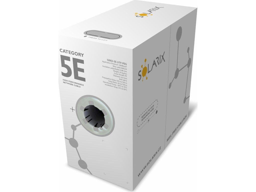 Instalační kabel Solarix s označením SXKD-5E-UTP-PEG je spolehlivý venkovní nestíněný kabel kategorie 5E, který je určený pro provoz ethernetových protokolů, včetně 2.5GBASE-T a 5GBASE-T*. Konstrukce kabelu je U/UTP, kabel je rovněž vyplněn gelem pro zajištění lepší odolnost proti vlhkosti. Typ pláště je UV stabilní PE s třídou reakce na oheň Fca a stupněm krytí IP67. Vodiče kabelu jsou vyrobeny z kvalitního měděného drátu s čistotou mědi 99,97 %. Kabel bez problémů splňuje požadavky z mezinárodních standardů ISO/IEC 11801, EN 50173 a ANSI/TIA 568.2-D. Stejně jako ostatní kabely Solarix, je i kabel SXKD-5E-UTP-PEG značen metráží po 1 m v rozsahu od 0 do 305 m. Kabel je dodáván ve vysoce odolném třívrstvém leštěném kartónovém boxu (vždy barevně odlišeném podle typu kabelu), na kterém jsou uvedeny všechny nezbytné produktové informace, včetně čárových kódů, výrobní šarže, popisu a nejdůležitějších technických parametrů. Tento kabel není určen pro trvalé uložení do vody ani do země bez odpovídající řádné ochrany.