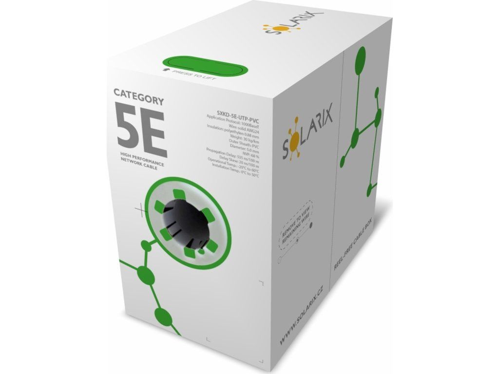 Instalační kabel Solarix s označením SXKD-5E-UTP-PVC je spolehlivý nestíněný kabel kategorie 5E, který je určený pro provoz ethernetových protokolů, včetně 2.5GBASE-T a 5GBASE-T*. Konstrukce kabelu je U/UTP, typ pláště PVC s třídou reakce na oheň Eca. Vodiče kabelu jsou vyrobeny z kvalitního měděného drátu s čistotou mědi 99,97 %. Kabel bez problémů splňuje požadavky z mezinárodních standardů ISO/IEC 11801, EN 50173 a ANSI/TIA 568.2-D. V případě CPR (nařízení EU č. 305/2011) je kabel testován u nezávislé laboratoře FORCE TECHNOLOGY v systému posuzování vlastností AVCP 3. Stejně jako ostatní kabely Solarix, je i kabel SXKD-5E-UTP-PVC značen metráží po 1 m v rozsahu od 0 do 305 m. Kabel je dodáván ve vysoce odolném třívrstvém leštěném kartónovém boxu (vždy barevně odlišeném podle typu kabelu), na kterém jsou uvedeny všechny nezbytné produktové informace, včetně čárových kódů, výrobní šarže, popisu a nejdůležitějších technických parametrů.