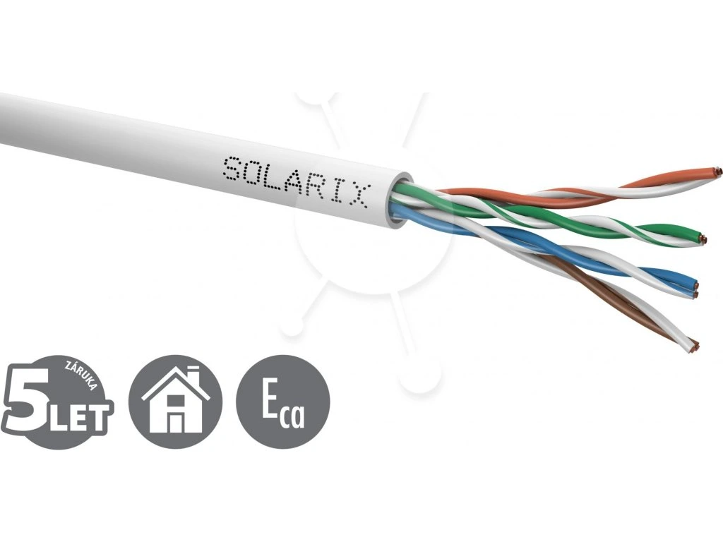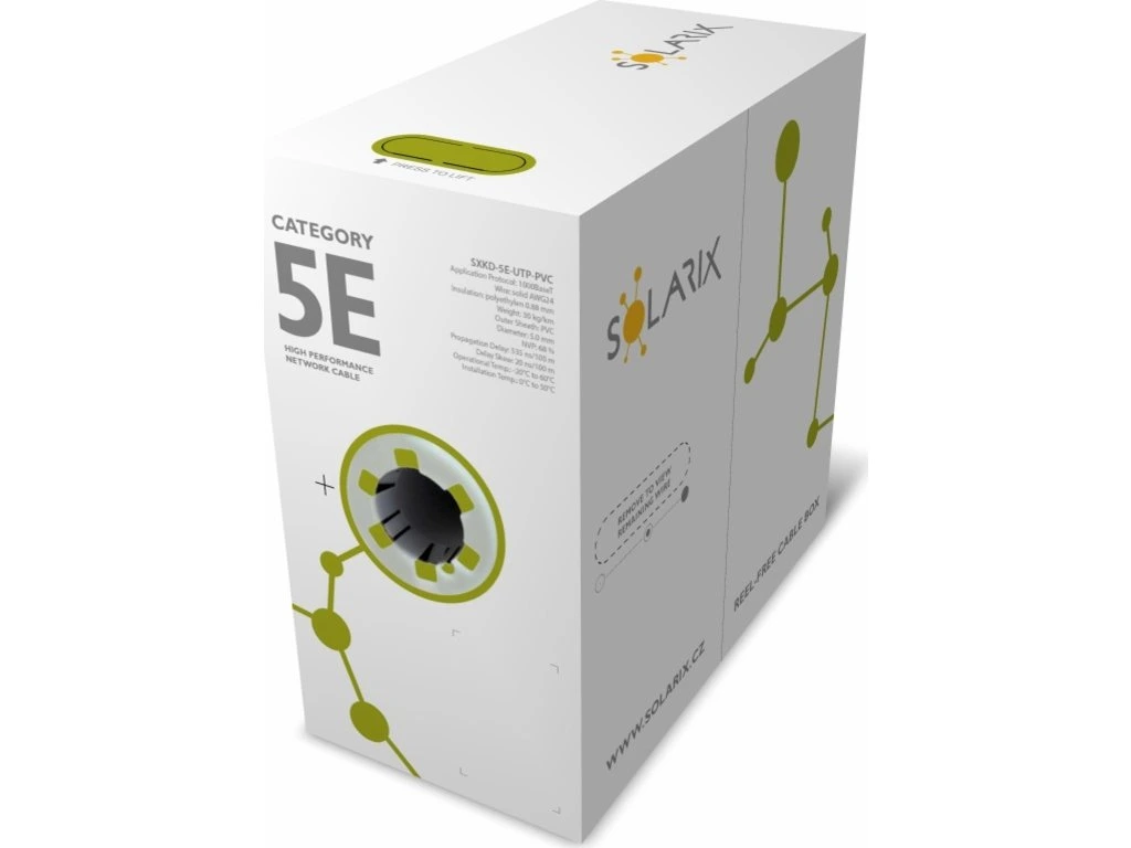 Instalační kabel Solarix s označením SXKD-5E-UTP-PVC je spolehlivý nestíněný kabel kategorie 5E, který je určený pro provoz ethernetových protokolů, včetně 2.5GBASE-T a 5GBASE-T*. Konstrukce kabelu je U/UTP, typ pláště PVC s třídou reakce na oheň Eca. Vodiče kabelu jsou vyrobeny z kvalitního měděného drátu s čistotou mědi 99,97 %. Kabel bez problémů splňuje požadavky z mezinárodních standardů ISO/IEC 11801, EN 50173 a ANSI/TIA 568.2-D. V případě CPR (nařízení EU č. 305/2011) je kabel testován u nezávislé laboratoře FORCE TECHNOLOGY v systému posuzování vlastností AVCP 3. Stejně jako ostatní kabely Solarix, je i kabel SXKD-5E-UTP-PVC značen metráží po 1 m v rozsahu od 0 do 500 m. Kabel je dodáván ve vysoce odolném třívrstvém leštěném kartónovém boxu (vždy barevně odlišeném podle typu kabelu), na kterém jsou uvedeny všechny nezbytné produktové informace, včetně čárových kódů, výrobní šarže, popisu a nejdůležitějších technických parametrů.