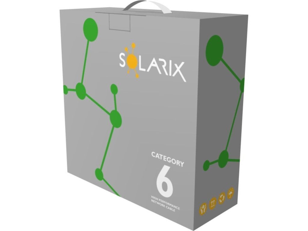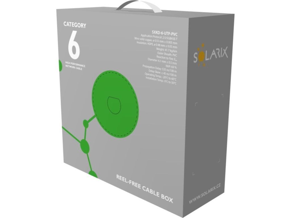 POZOR, nový 100 m box. Instalační kabel Solarix s označením SXKD-6-UTP-PVC je spolehlivý nestíněný kabel kategorie 6, který je určený pro provoz ethernetových protokolů, včetně 2.5GBASE-T a 5GBASE-T. Konstrukce kabelu je U/UTP s plastovým křížem, který zajišťuje maximální oddělení párů od sebe po celé délce kabelu. Typ pláště je PVC s třídou reakce na oheň Eca. Vodiče kabelu jsou vyrobeny z kvalitního měděného drátu s čistotou mědi 99,97 %. Kabel bez problémů splňuje požadavky z mezinárodních standardů ISO/IEC 11801, EN 50173 a ANSI/TIA 568.2-D. V případě CPR (nařízení EU č. 305/2011) je kabel testován u nezávislé laboratoře FORCE TECHNOLOGY v systému posuzování vlastností AVCP 3. Stejně jako ostatní kabely Solarix, je i kabel SXKD-6-UTP-PVC značen metráží po 1 m v rozsahu od 0 do 100 m. Kabel je dodáván ve vysoce odolném třívrstvém leštěném kartónovém boxu, na kterém jsou uvedeny všechny nezbytné produktové informace, včetně čárových kódů, výrobní šarže, popisu a nejdůležitějších technických parametrů.