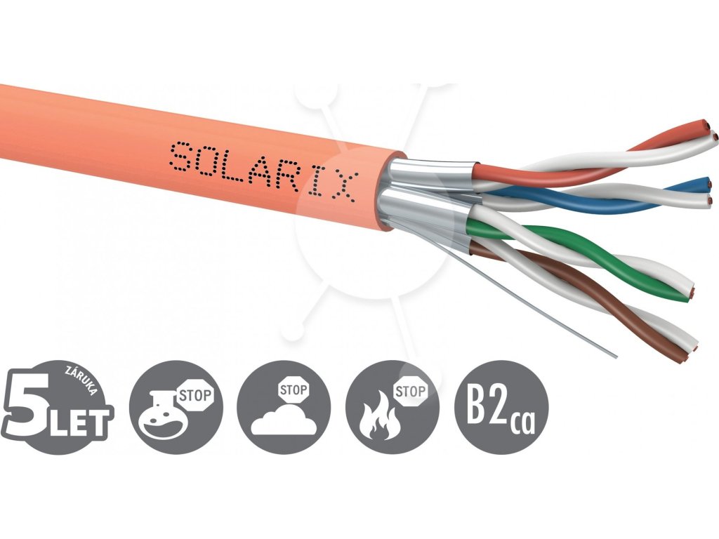 Instalační kabel Solarix s označením SXKD-6A-STP-LSOH-B2ca je vysoce kvalitní stíněný kabel kategorie 6A, který je určený pro provoz vysokorychlostních ethernetových protokolů, včetně 10GBASE-T. Konstrukce kabelu je U/FTP, typ pláště LSOH s třídou reakce na oheň B2ca-s1,d1,a1. Vodiče kabelu jsou vyrobeny z kvalitního měděného drátu s čistotou mědi 99,97 %. Kabel bez problémů splňuje požadavky z mezinárodních standardů ISO/IEC 11801, EN 50173 a ANSI/TIA 568.2-D. Výkonové parametry tohoto kabelu byly otestovány nezávislou testovací zkušebnou FORCE TECHNOLOGY v rámci programu EC Verified, a to na nejvyšší úroveň tzv. Component Level. Certifikát je k dispozici zde na webu v záložce "Odkazy" nebo přímo na stránkách laboratoře FORCE. V případě CPR (nařízení EU č. 305/2011) je kabel testován v systému posuzování vlastností AVCP 1+ a rovněž splňuje vyhlášku MV ČR č. 23/2008 resp. vyhlášku č. 268/2011 o technických podmínkách požární ochrany staveb a je vhodný pro způsoby použití odpovídající kabelu s touto třídou reakce na oheň, které jsou definovány v Příloze č. 2 těchto vyhlášek. Stejně jako ostatní kabely Solarix, je i kabel SXKD-6A-STP-LSOH-B2ca značen metráží po 1 m v rozsahu od 0 do 500 m. Kabel je dodáván na vysoce pevné dřevěné cívce, na které jsou uvedeny všechny nezbytné produktové informace, včetně čárových kódů, výrobní šarže, popisu a nejdůležitějších technických parametrů.
