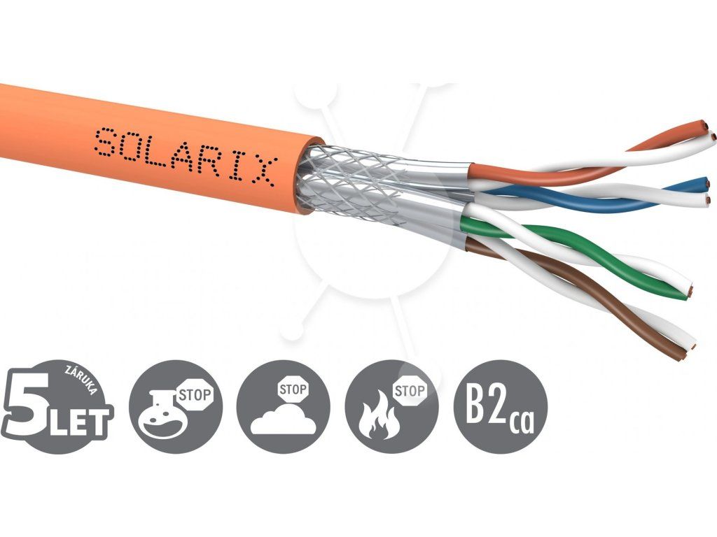 Instalační kabel Solarix s označením SXKD-7A-1200-SSTP-LSOHFR-B2ca je vysoce kvalitní dvakrát stíněný kabel kategorie 7A, který je testovaný až do šířky pásma 1 200 MHz a je určený pro provoz vysokorychlostních ethernetových protokolů, včetně 10GBASE-T. Konstrukce kabelu je S/FTP, typ pláště LSOHFR s třídou reakce na oheň B2ca-s1,d1,a1. Vodiče kabelu jsou vyrobeny z kvalitního měděného drátu s čistotou mědi 99,97 %. Kabel bez problémů splňuje požadavky z mezinárodních standardů ISO/IEC 11801 a EN 50173. Výkonové parametry tohoto kabelu byly otestovány nezávislou testovací zkušebnou FORCE TECHNOLOGY v rámci programu EC Verified, a to na nejvyšší úroveň tzv. Component Level. Certifikát je k dispozici zde na webu v záložce "Odkazy" nebo přímo na stránkách laboratoře FORCE. V případě CPR (nařízení EU č. 305/2011) je kabel testován u nezávislé laboratoře FORCE CERTIFICATION v systému posuzování vlastností AVCP 1+ a rovněž splňuje vyhlášku MV ČR č. 23/2008 resp. vyhlášku č. 268/2011 o technických podmínkách požární ochrany staveb a je vhodný pro způsoby použití odpovídající kabelu s touto třídou reakce na oheň, které jsou definovány v Příloze č. 2 těchto vyhlášek. Stejně jako ostatní kabely Solarix, je i kabel SXKD-7A-1200-SSTP-LSOHFR-B2ca značen metráží po 1 m v rozsahu od 0 do 500 m. Kabel je dodáván na vysoce pevné dřevěné cívce, na které jsou uvedeny všechny nezbytné produktové informace, včetně čárových kódů, výrobní šarže, popisu a nejdůležitějších technických parametrů.