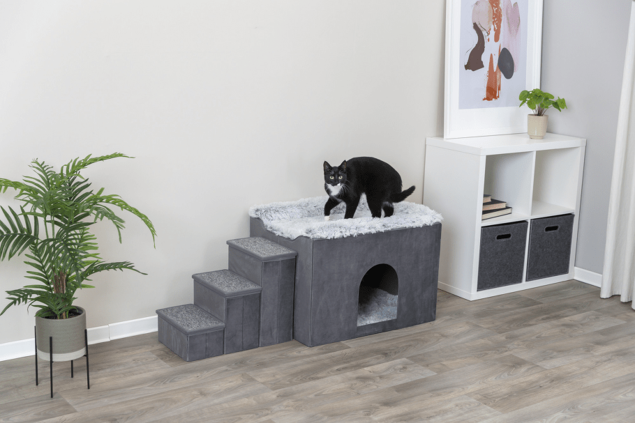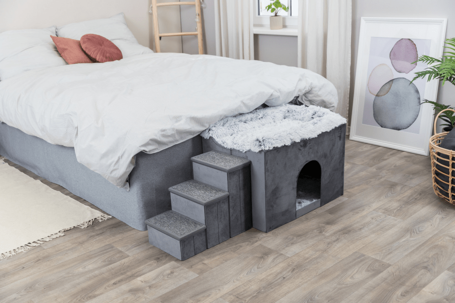 Dopřejte svému psímu parťákovi místo, kde se může cítit v bezpečí, pohodlí a blízkosti vás. Interiérová boudička HARVEY se schůdky spojuje útulný pelíšek, praktické schůdky k posteli a chytrý úložný prostor v jednom. Ideální řešení pro chlupáče, kteří chtějí být nablízku, ale potřebují vlastní klid.