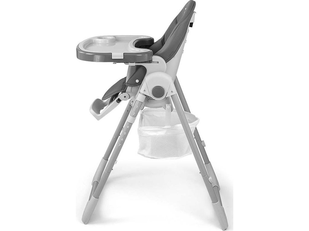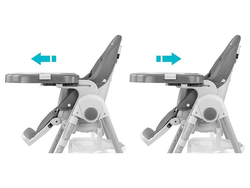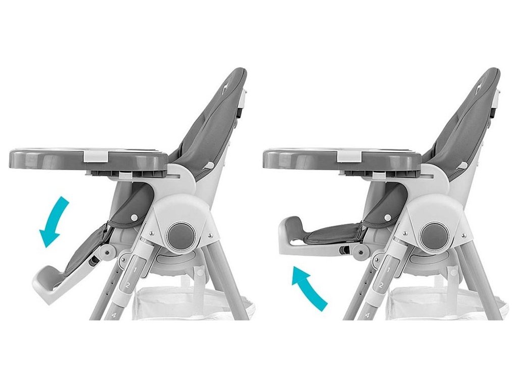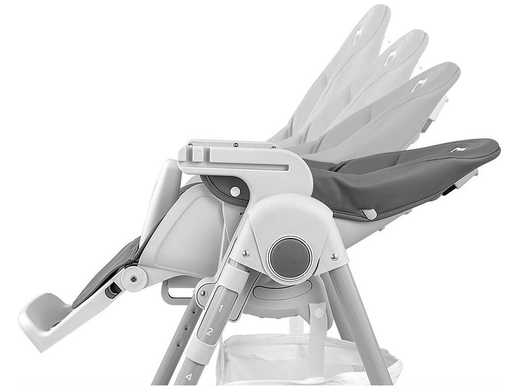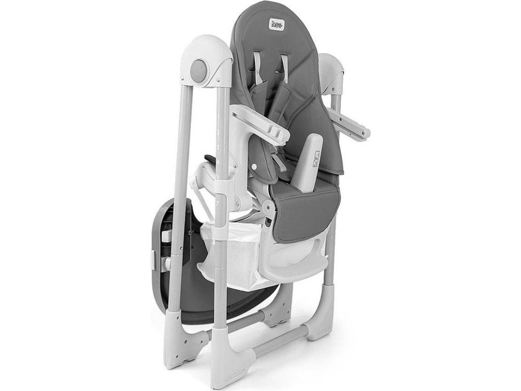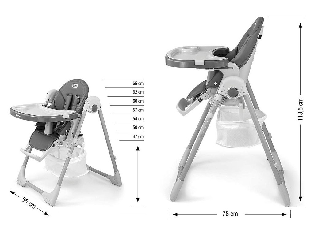 Čalounění židle je vyrobeno z ekologické kůže a má navíc měkkou vložku pro nejmenší. Pro bezpečnost dítěte je vybavena 5-ti bodovými nastavitelnými pásy a přídavnou zábranou proti uklouznutí. Na zadní straně opěradla je úchyt pro zavěšení tácu. Opěradlo i podnožku lze sklopit do lehu. Sedák lze zvednout nebo snížit v 7 stupních a nohy mají zabudovaná gumová kolečka. Celou konstrukci lze snadno a hladce složit.
