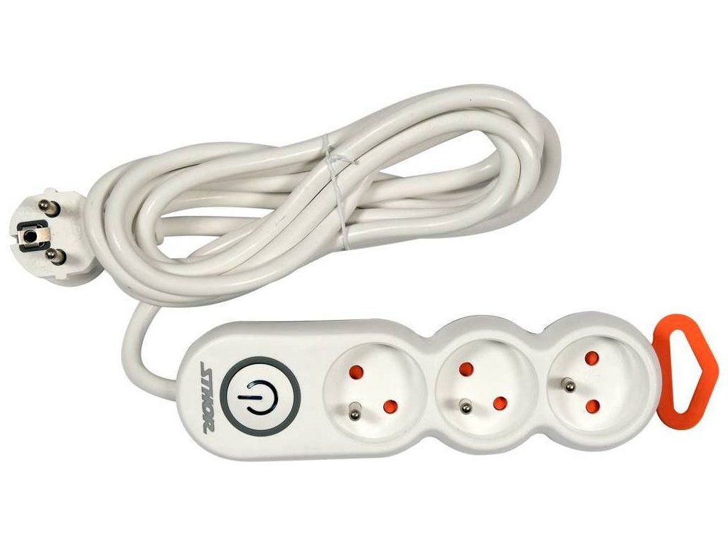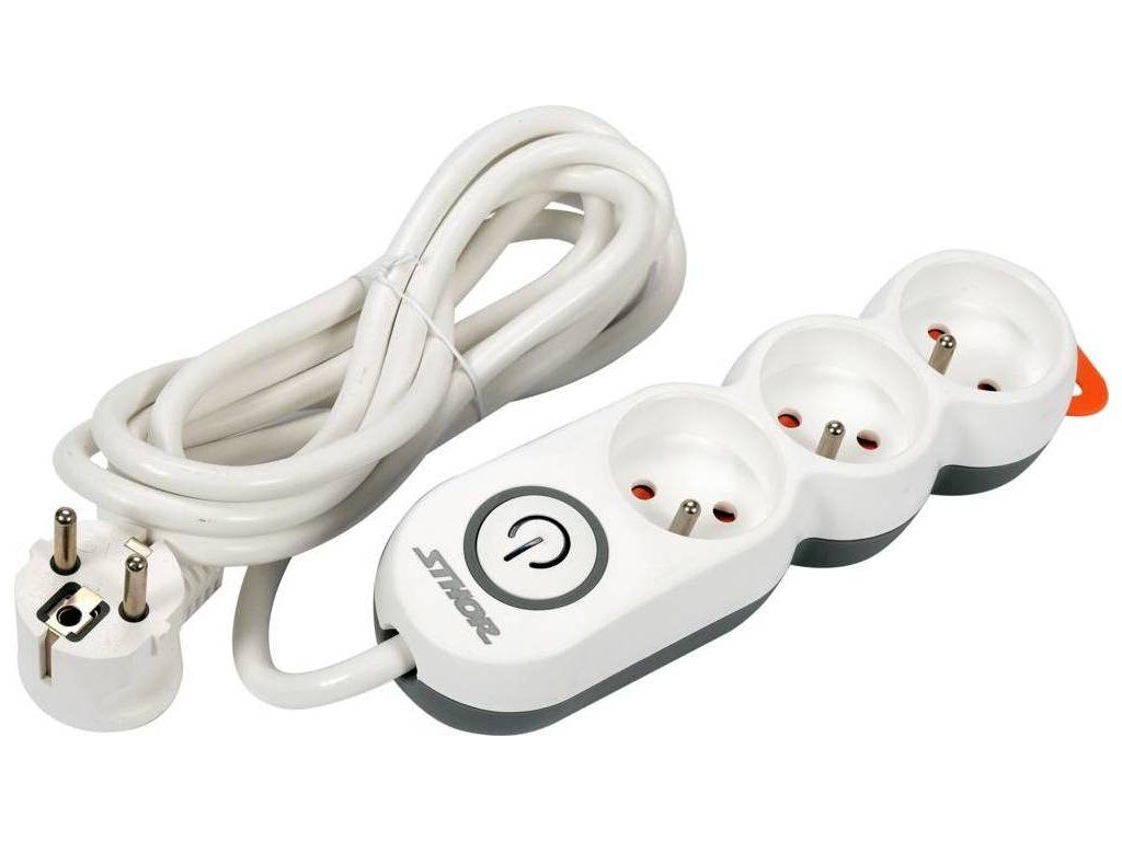 Prodlužuvací kabel, který má uzemněné zásuvky a vypínač od značky Sthor.
