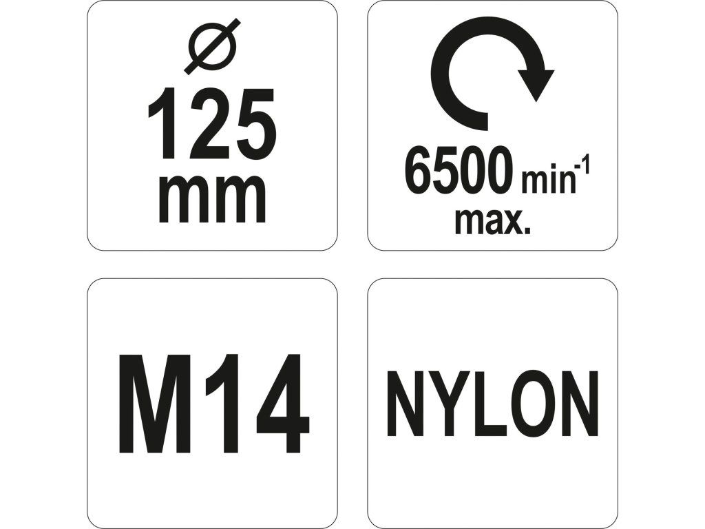 Kotouč má průměr 125 mm, je vhodný pro použití do 6500 ot/min a je opatřen upínácím závitem M14.