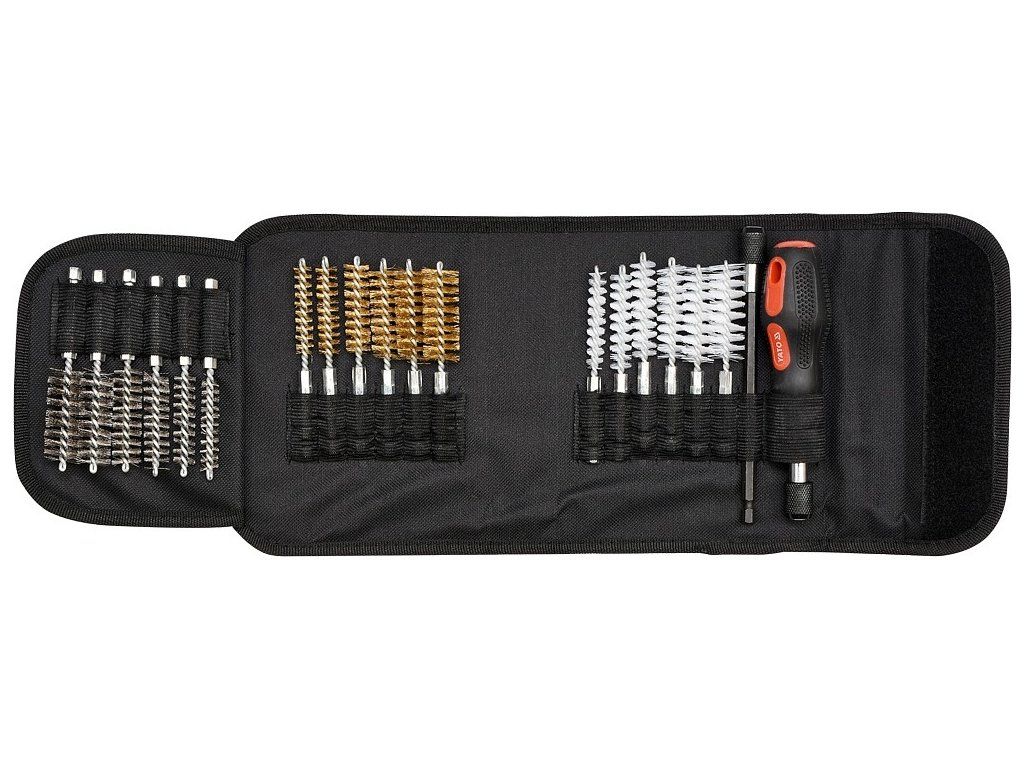 Součástí je také rukojeť kartáčů v provedení šroubovák. Vše je osazené v praktickém uzavíratelném pouzdře.