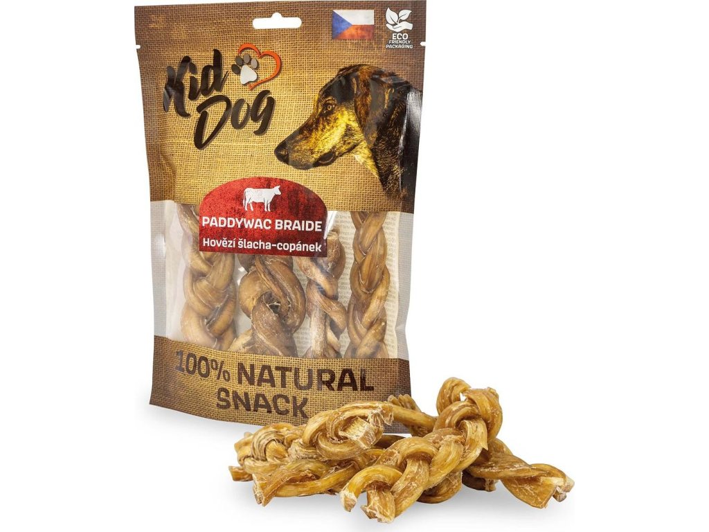 KIDDOG NATURAL SNACK je vysoce kvalitní pamlsek, 100% přírodní produkt šetrně sušený teplým vzduchem. Neobsahuje žádné konzervanty a barviva. Díky svému pletenému tvaru účinně pomáhá při čištění zubů od zubního plaku. Posiluje žvýkací svaly. Je velmi odolný a bohatý na přírodní kolagen. Vhodný pro střední a velká plemena.