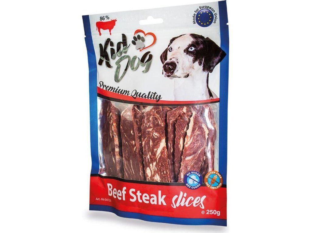 Kiddog Premium Snack s vysokým obsahem hovězího masa 86 % a živočišného proteinu min. 45 % ve tvaru pásku jsou ideálním doplňkem stravy. Složení je bezlepkové (neobsahují obiloviny) s nízkým obsahem tuku. Mají výrazně masitou chuť. Jsou jedinečnou volbou buď jako pamlsek anebo odměna při výcviku.