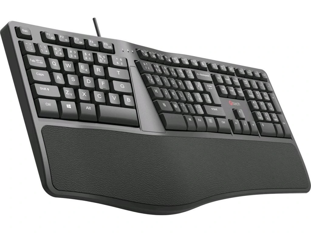 Ergonomická klávesnice C-TECH KB-113E byla navržena pro ty, kteří tráví prací mnoho hodin. Svým speciálním konstrukčním řešením a měkkou předložkou Vám tato klávesnice pomůže minimalizovat Vaši únavu při dlouhé práci. Pomáhá také podobně jako vertikální myš předejít, nebo zmírnit dopady onemocnění karpálního tunelu.