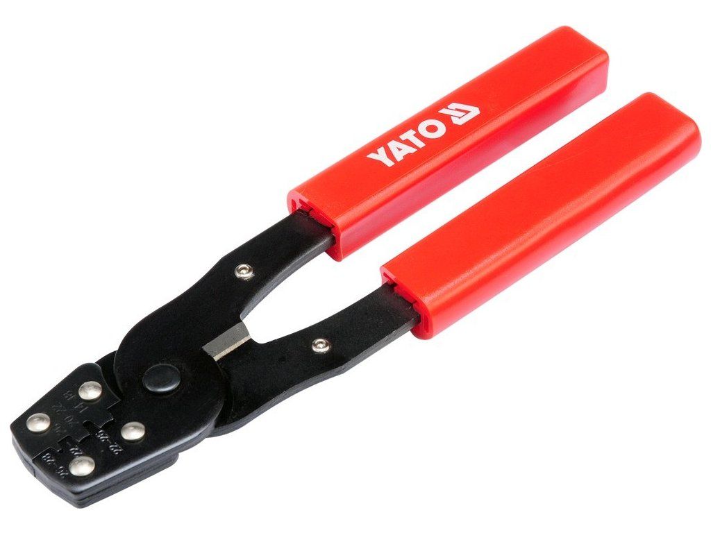 Kleště YT-2255 pro krimpování dvou typů konektorů, se zčernalým povrchem, který chrání před korozí, a s plastovými kryty rukojetí.