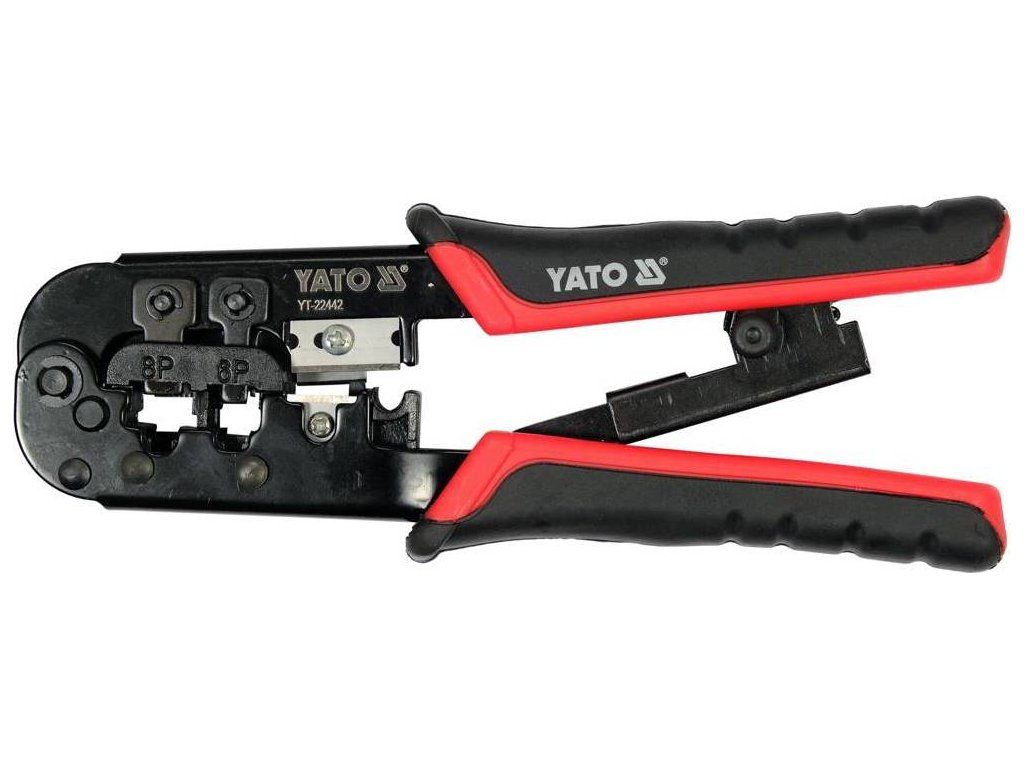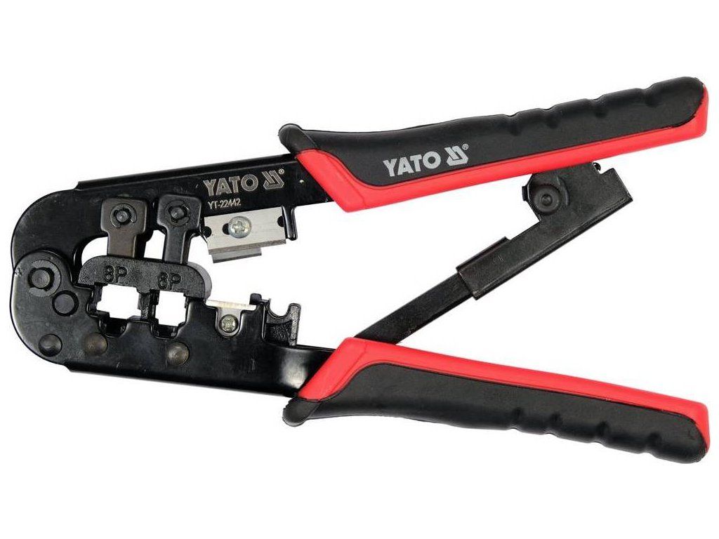 Kleště YT-2244 na krimpování telefonních a síťových terminálů, zčernalý povrch, který chrání před korozí, a s plastovými kryty rukojetí.