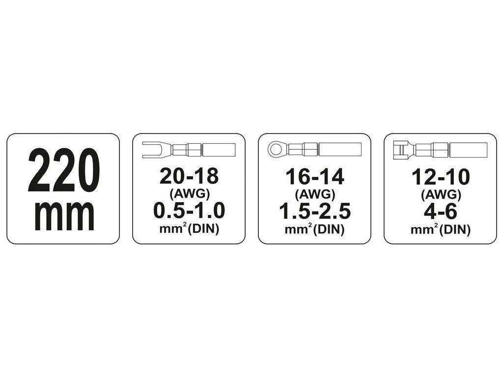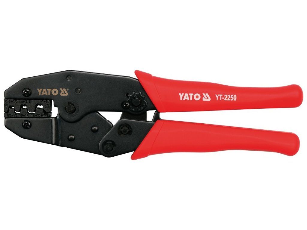 Kleště YT-2250 pro krimpování izolovaných konektorů, se zčernalým povrchem, který chrání před korozí, a s plastovými kryty rukojetí. Rohatkový mechanismus umožňuje rychlé a přesné upnutí bez použití nadměrné síly.