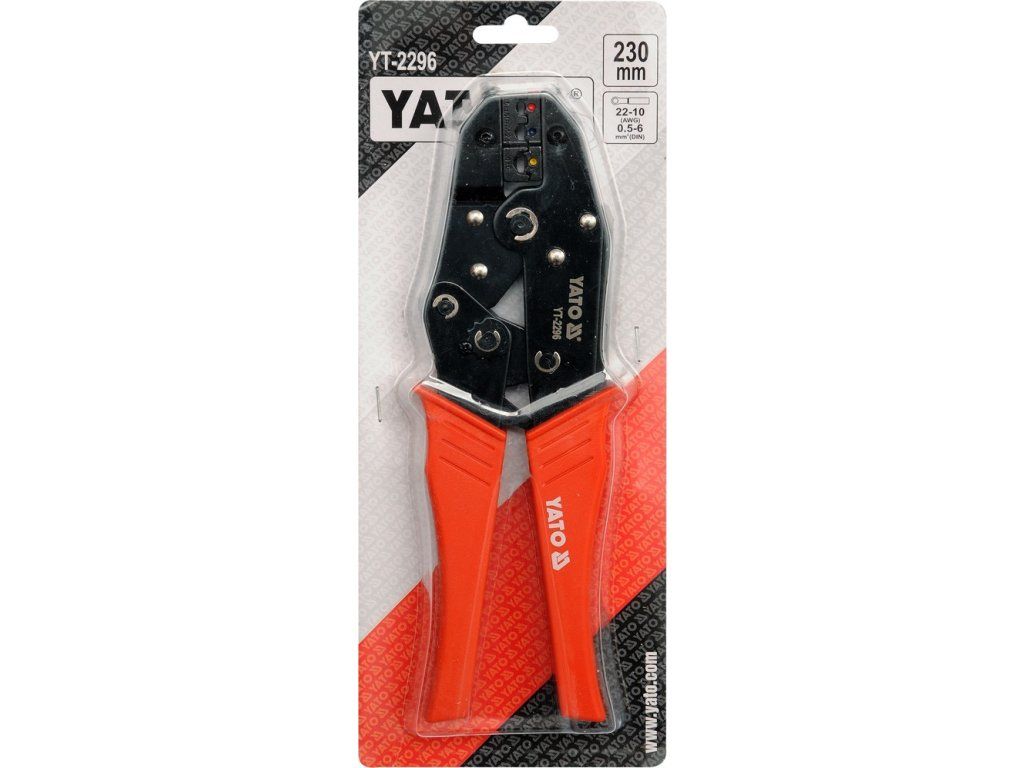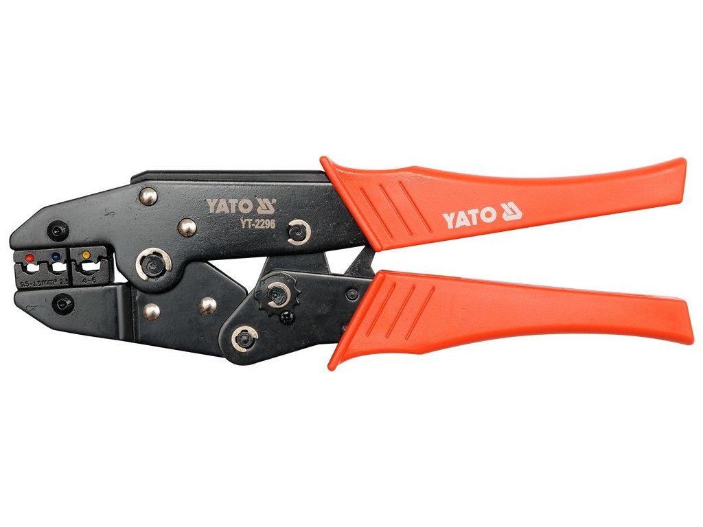 Kleště YT-2296 pro krimpování neizolovaných konektorů, se zčernalým povrchem, který chrání před korozí, a s plastovými kryty rukojetí. Rohatkový mechanismus umožňuje rychlé a přesné upnutí bez použití nadměrné síly.
