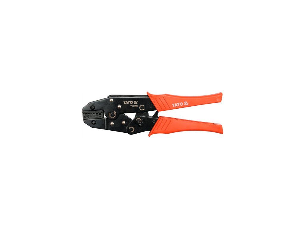 Kleště YT-2299 pro krimpování neizolovaných konektorů, se zčernalým povrchem, který chrání před korozí, a s plastovými kryty rukojetí. Rohatkový mechanismus umožňuje rychlé a přesné upnutí bez použití nadměrné síly.