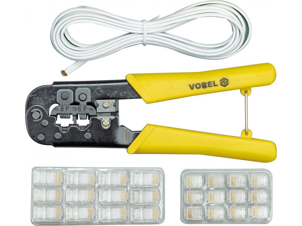 Sada konektorových kleští s kabelem a konektory (6P - RJ11/12 a 8P - RJ45).