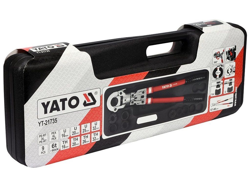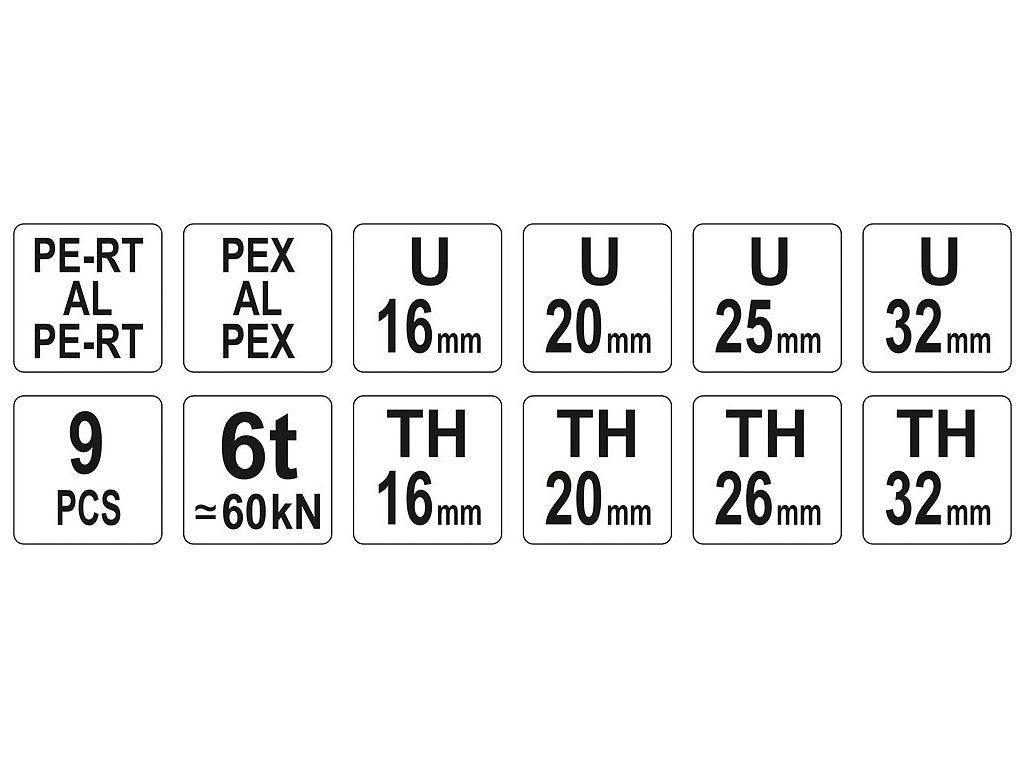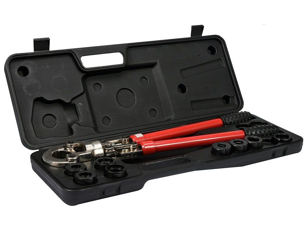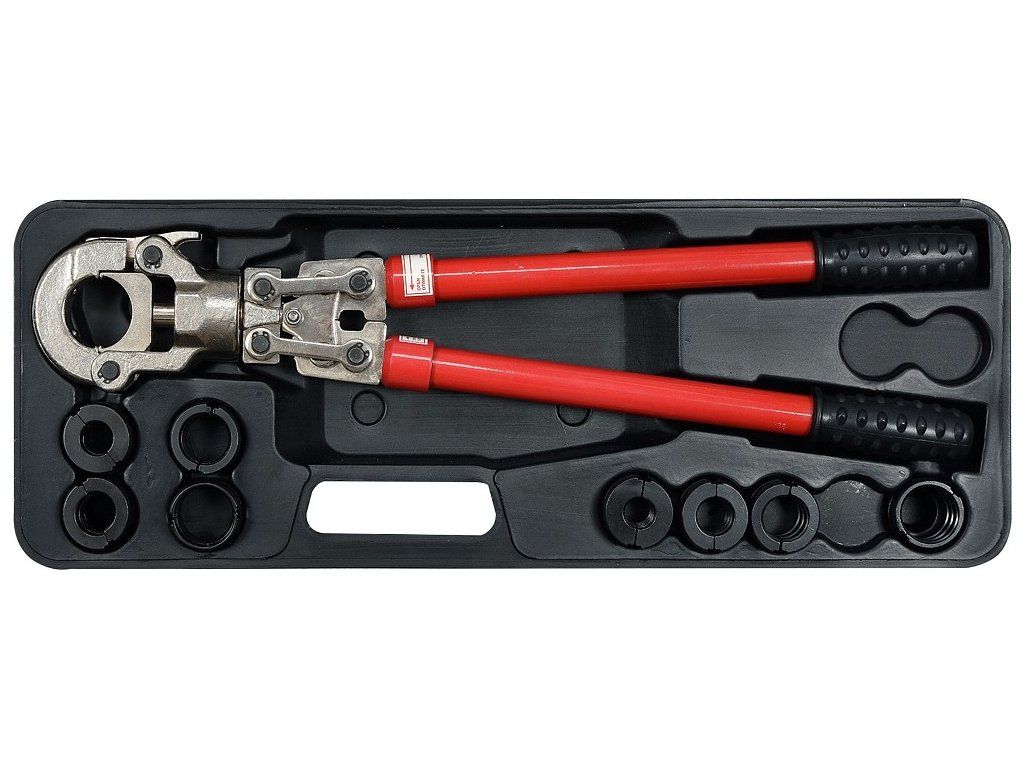 Lisovací kleště na plastové vodovodní potrubí PEX-AL-PEX, PERT-AL-PERT se sadou 8 výměnných čelistí U a TH.