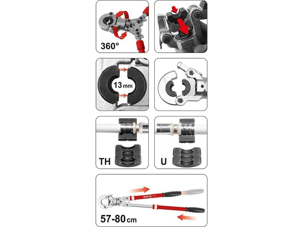 Kleště jsou vybaveny hydraulickým pohonem, který umožňuje lisování silou až 60 kN. Otočná hlava umožňuje práci v těžko přístupných místech. Rukojeti kleští jsou teleskopické, lze je prodloužit z 57 cm až do 80 cm a tím vytvořit ještě větší páku pro důkladné spojení.