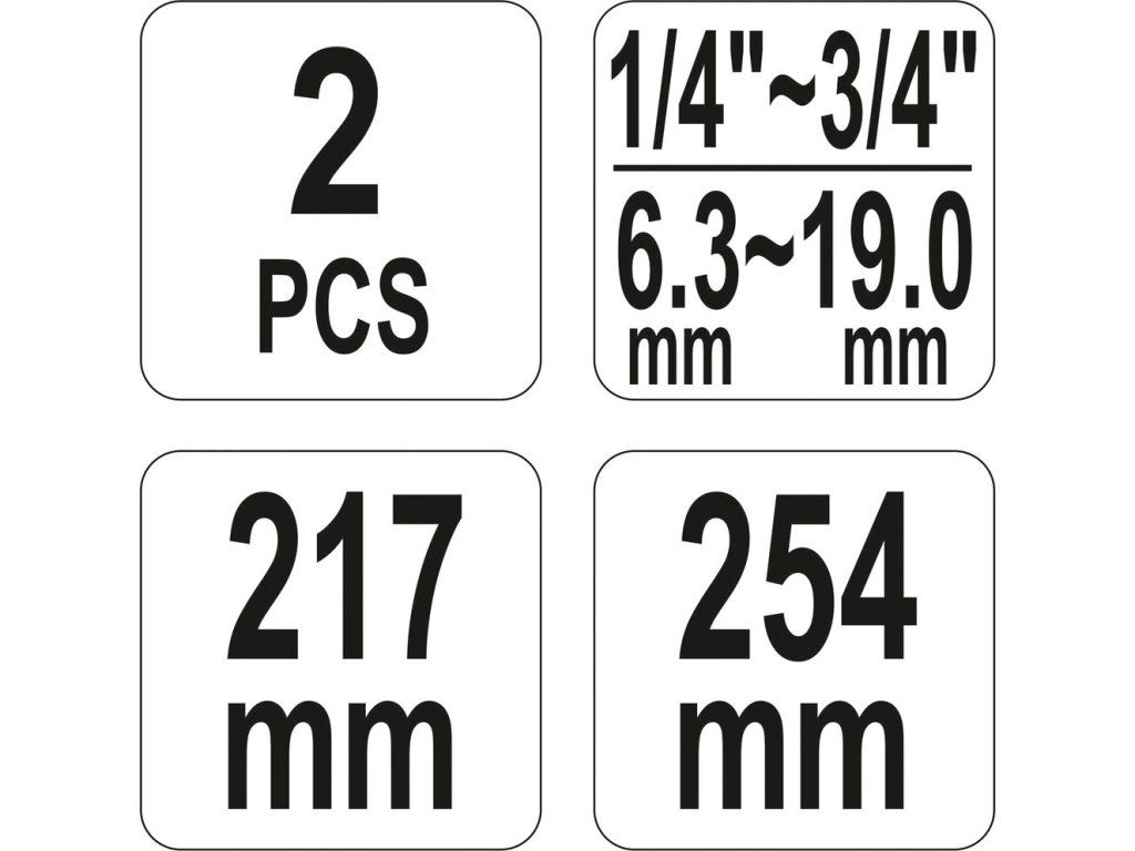 Délka kleští 217 a 254 mm, čelisti 1/4" - 3/4" (6,3 - 19 mm).