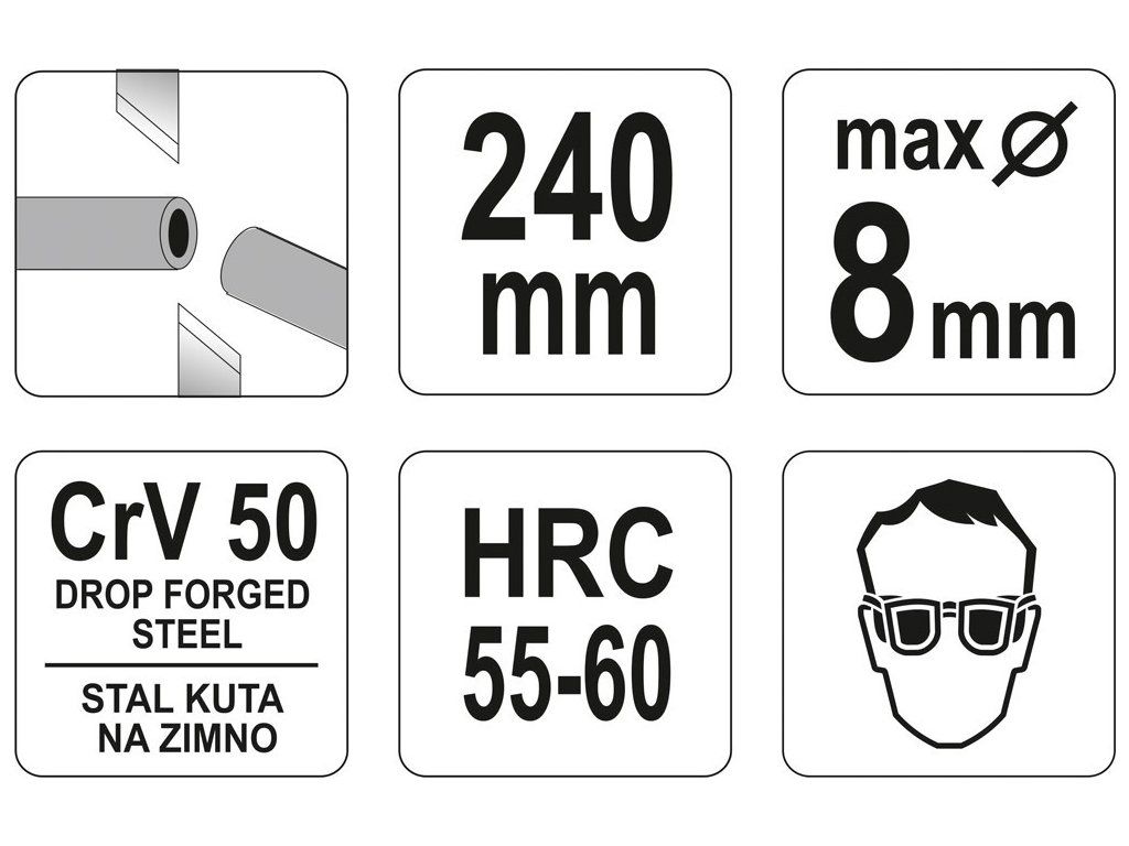 Zhotovené z CrV-50 oceli 55-60 HRC. Oplastované rukpojeti zabezpečují míru komfortu při práci.