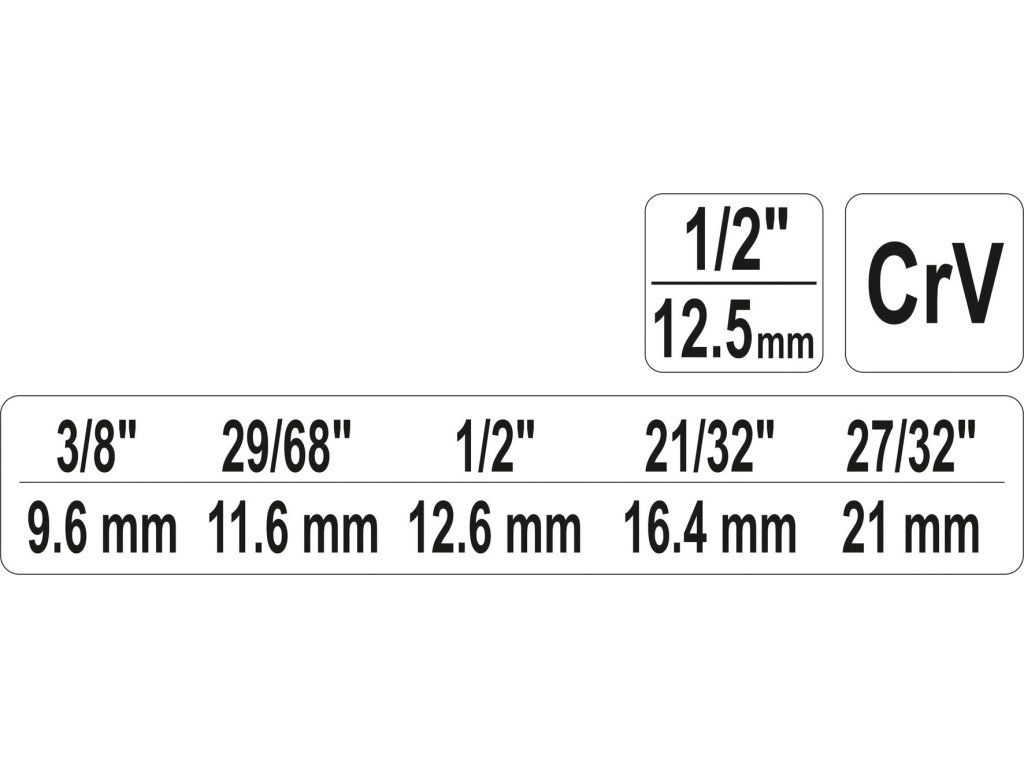 Klíč na radiátorové šroubení je univerzální klíč pro montáž a demontáž radiátorových dílů s uchycením pro 1/2" ráčnu. Velikosti stupňovitých klíčů 3/8" (9,6 mm) / 29/68" (11,6 mm) / 1/2" (12,6 mm) / 21/32" (16,4 mm) / 27 / 32 "(21 mm) s 1/ 2" pohon vyrobený z vysoce kvalitní oceli CRV.